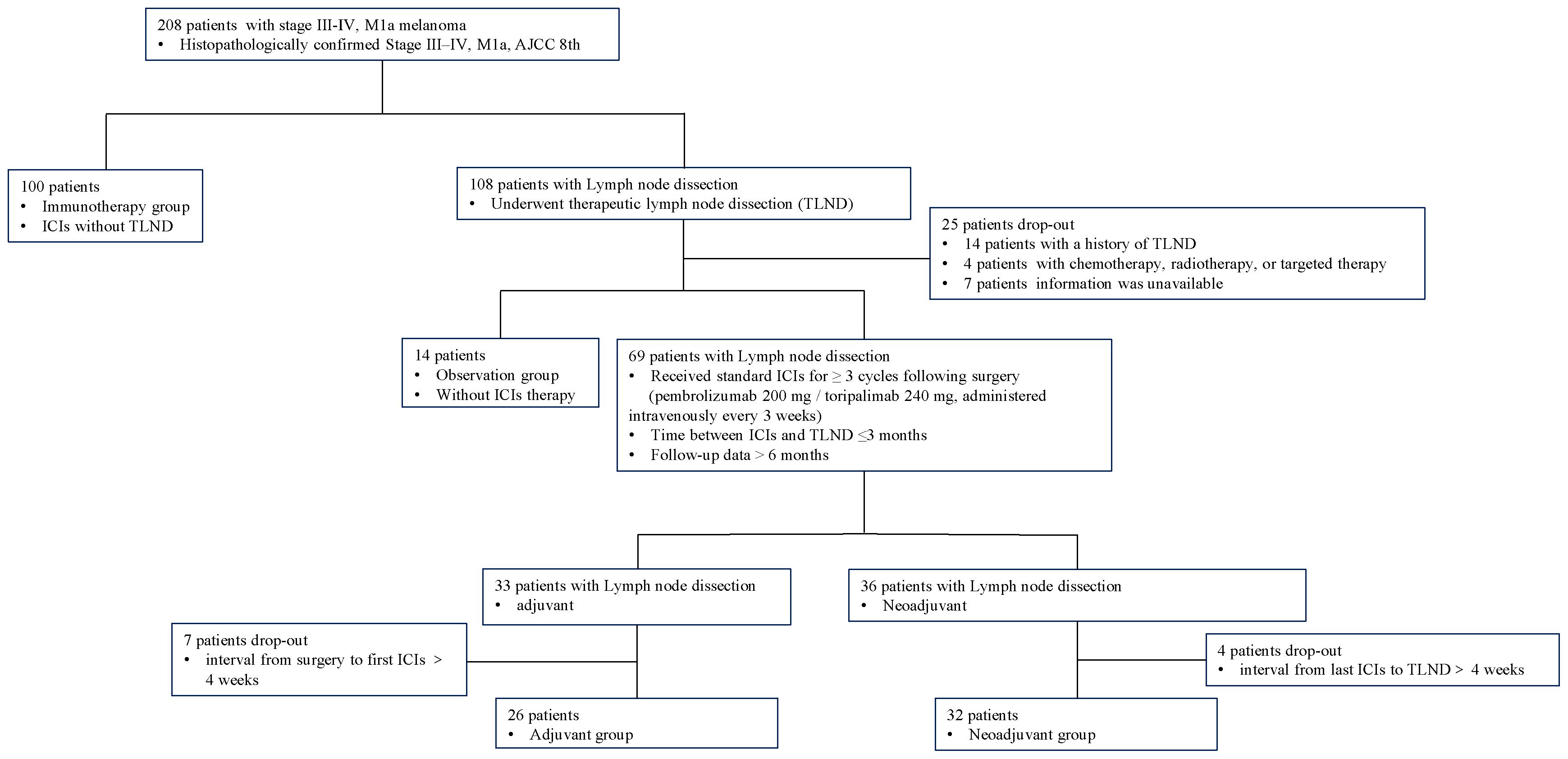 The Asian population exhibits distinct clinicopathological features: acral melanoma accounts for of cases 50–60% (vs. <5% in Caucasians) (12), which results in earlier lymph node metastasis, inferior survival outcomes (12, 13), and attenuated responses to immunotherapy (14–16). Consequently, the generalizability of cutaneous melanoma-based nodal management to Asian populations warrants further investigation. Here, we assess how different treatment strategies involving lymph node management influence immunotherapy outcomes in Chinese patients with advanced melanoma, addressing this critical knowledge gap to provide evidence for optimized surgical timing in precision management.