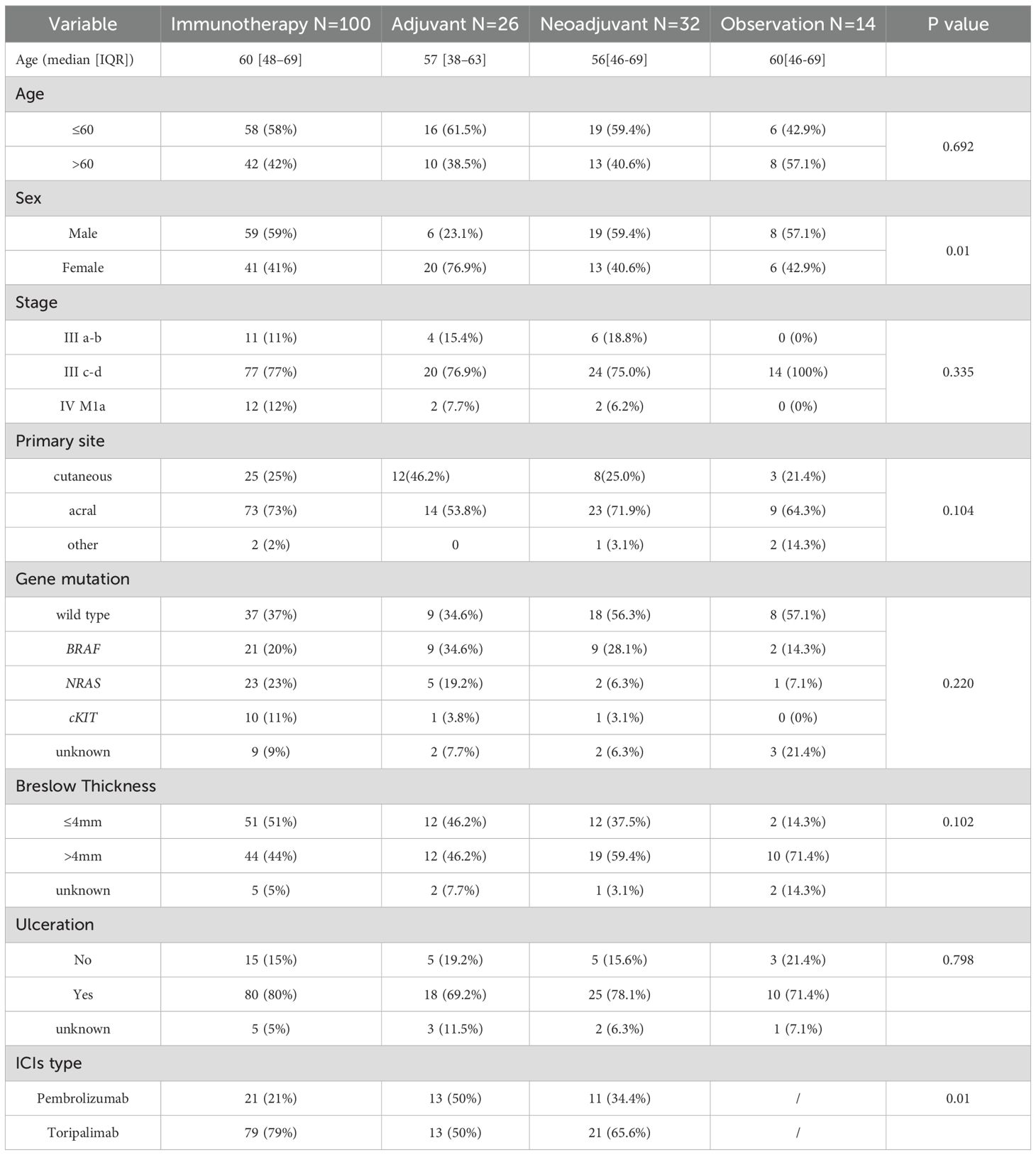 This study enrolled a total of 172 patients with stage III to IV, M1a melanoma, who were categorized into four groups according to different treatments. One hundred patients received immunotherapy without surgery, 32 underwent neoadjuvant therapy while 26 received adjuvant therapy, 14 patients received close observation after surgery. Baseline characteristics including age, primary site, clinical stage, Breslow thickness, ulceration status, and driver gene mutations were comparable across all groups (all P>0.05). Significant differences were observed in sex distribution (P<0.01) and types of ICIs(P<0.01) (Table 1).