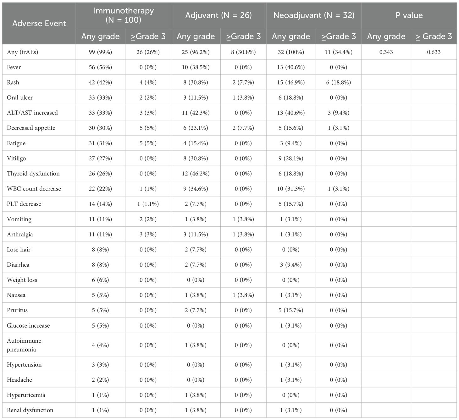 Adverse events were graded according to the Common Terminology Criteria for Adverse Events (CTCAE v5.0). This study was conducted in compliance with the Declaration of Helsinki, approved by the Ethics Committee of the Fourth Military Medical University (Approval No: KY20242252-F-1).