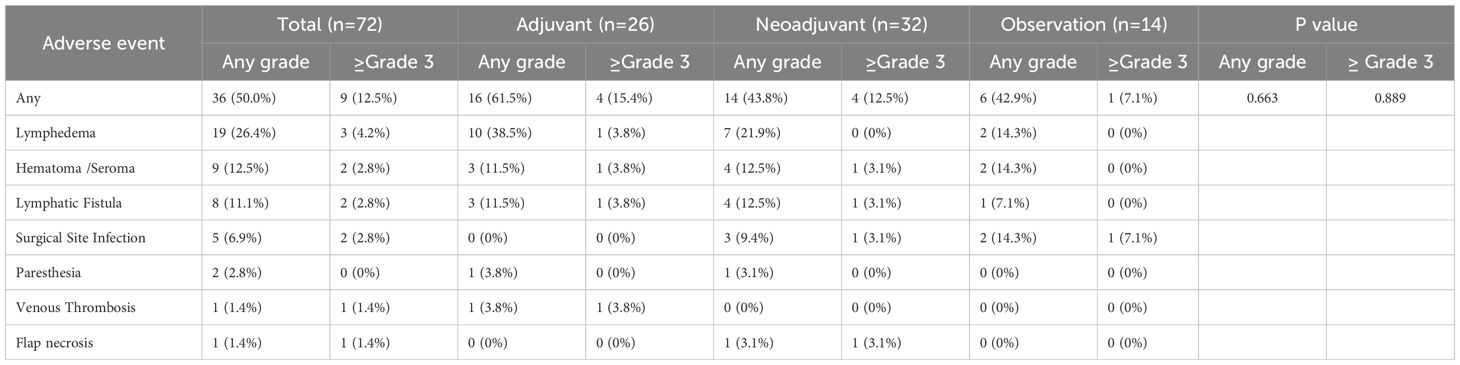 The incidence of immune-related adverse events (irAEs) was evaluated in the immunotherapy, neoadjuvant, and adjuvant groups while the surgery-related adverse events were analyzed in patients underwent TLND. The results demonstrated no statistically significant differences in the occurrence of either any-grade irAEs or grade ≥3 irAEs between treatment groups (Fisher’s exact test, Table 2). Among the 72 patients who underwent TLND, the overall incidence of surgery-related adverse events was 50.0%, with grade ≥3 surgery-related adverse events occurring in 12.5% of cases (as graded by CTCAE v5.0 criteria). No significant differences in surgery-related adverse events rates were observed among the different surgical groups (observation vs adjuvant vs neoadjuvant; all p>0.05). Lymphoedema following TLND emerged as the most frequent surgical complication (incidence 26.4%), with detailed characteristics of other complications presented in Table 3.