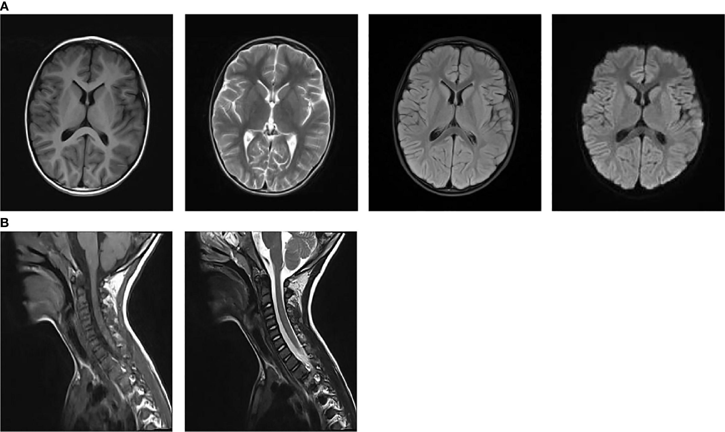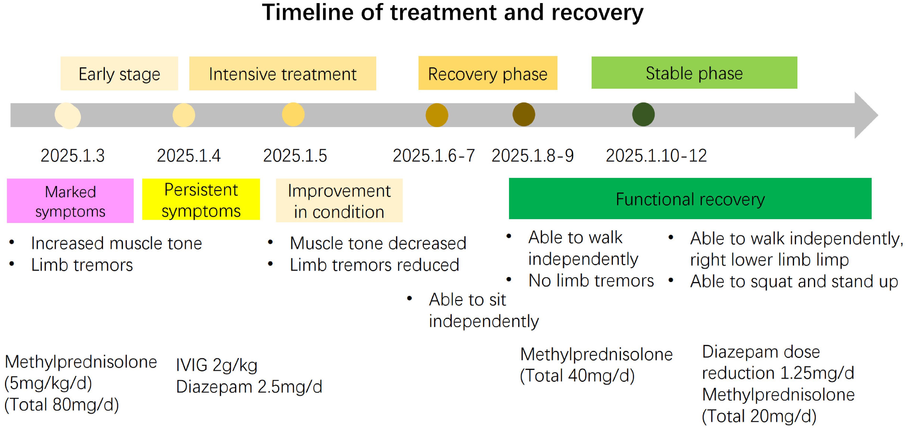On the 3rd day of admission, the patient was treated with IVIG at a total dose of 2 g/kg in 3 days as well as corticosteroids (5 mg/kg/day intravenous methylprednisolone, followed by a tapered reduction) for 10 days with significant efficacy. Oral diazepam was administered (2.5mg/d). Oseltamivir for influenza virus infection was implemented. The patient had no neurological sequel at the time of discharge (Figure 3). Given the negative antibody results during the initial phase and complete clinical resolution at follow-up, antibody re-testing was not performed. All medications were discontinued one-month post-discharge, with the patient exhibiting normal motor function and attending regular kindergarten without restrictions.