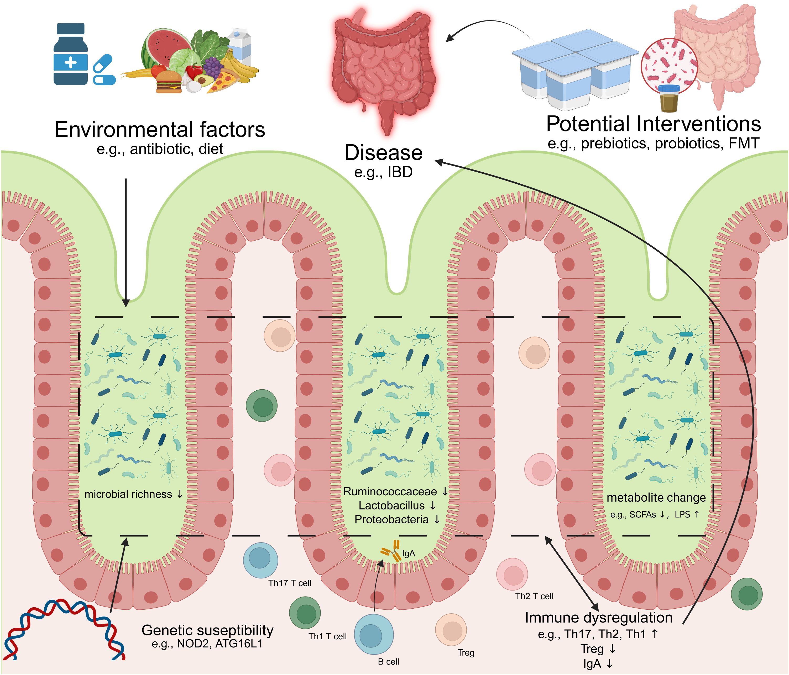 Figure 2. Dysregulation of microbiome-immunity interaction in disease. IBD, inflammatory bowel diseases; FMT, Fecal microbiota transplantation; Th17, T helper 17 cell; Th1, T helper 1 cell; Th2, T helper 2 cell; Treg, Regulatory T cell; SCFAs, Short-chain fatty acids; LPS, lipopolysaccharide(Created in https://BioRender.com).
