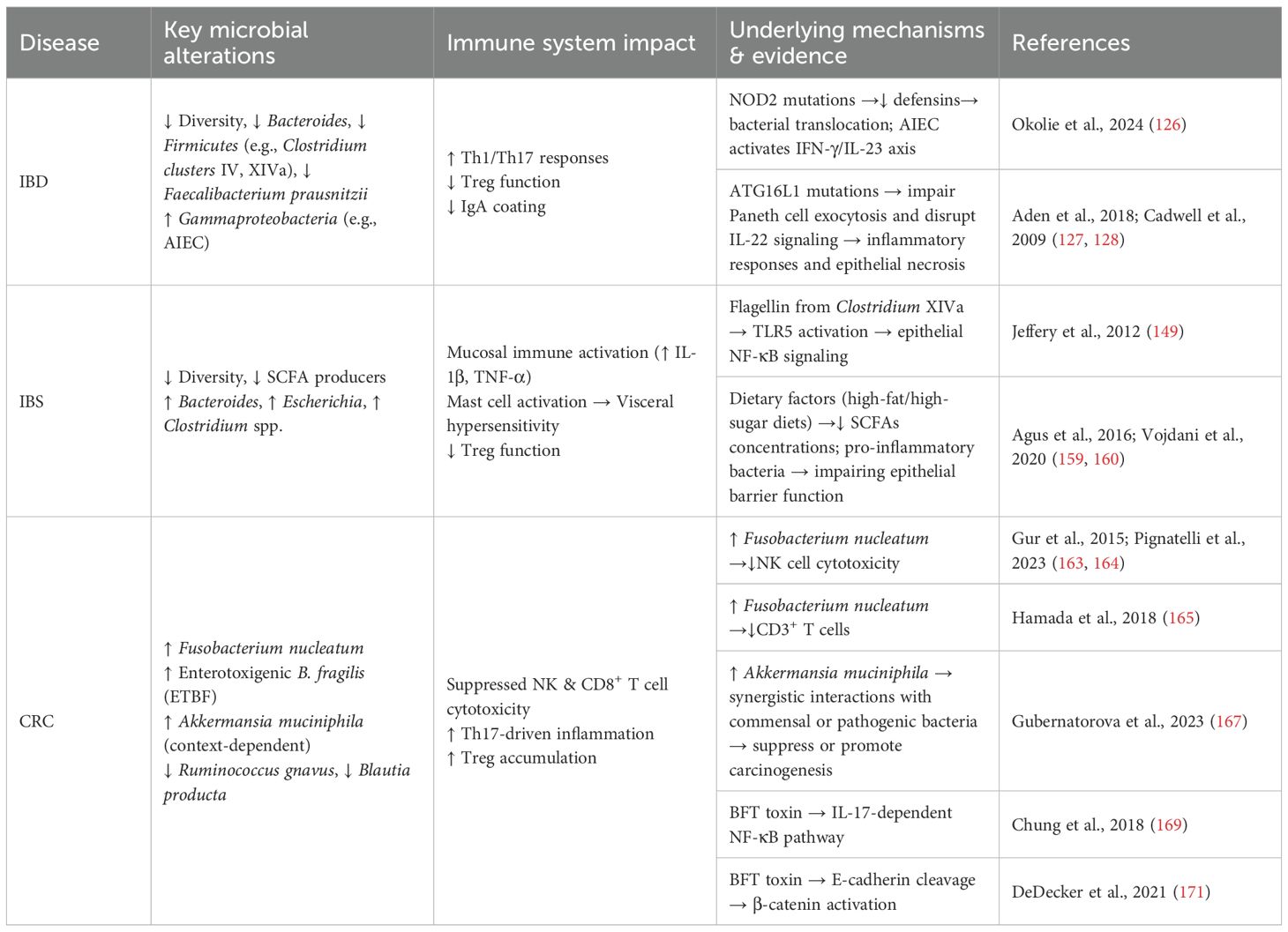 However, this meticulously balanced host-microbiota symbiosis is vulnerable to disruption. Pathological alterations in the gut microbial ecosystem, termed dysbiosis, are increasingly recognized as critical factors in the pathogenesis of a spectrum of intestinal disorders (14–17). Critically, immune dysregulation constitutes a central mechanistic link underpinning these conditions. Mounting evidence positions the gut microbiome as a pivotal regulator of immune ontogeny, response calibration, and mucosal barrier integrity (18). Consequently, disruptions in the intricate dialogue between the microbiota and the host immune system—encompassing failures in tolerance induction, aberrant inflammatory responses, and compromised barrier function—are implicated in the initiation and perpetuation of chronic inflammation observed in diseases such as IBD, IBS, and CRC. In this review, we synthesize current mechanistic insights into this bidirectional microbiota-immune crosstalk across both physiological homeostasis and major intestinal pathologies. Furthermore, we evaluate emerging therapeutic strategies aimed at modulating this critical axis to restore health, highlighting the pivotal role of understanding these interactions for developing novel interventions against dysbiosis-associated intestinal diseases.