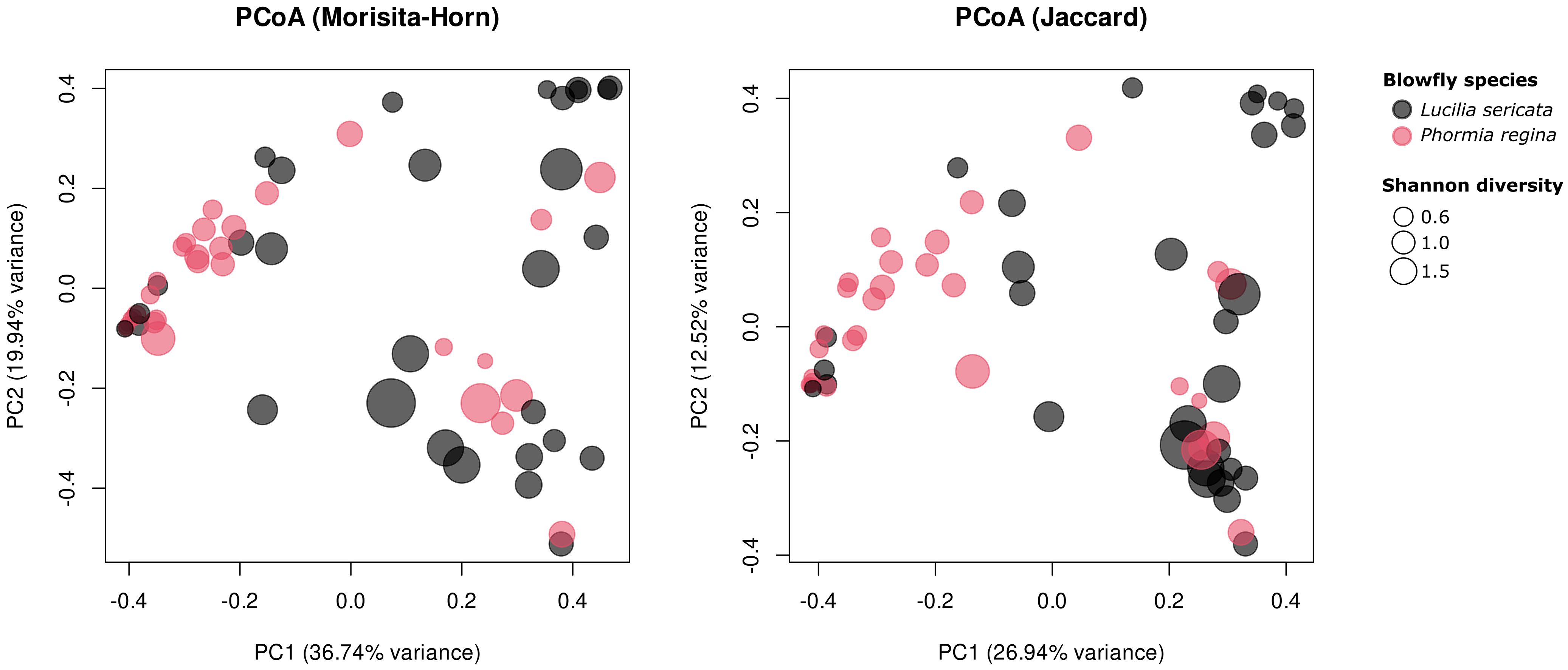Figure 1. Principal coordinate analysis of blow fly microbiome composition using (left panel) Morisita-Horn and (right panel) Jaccard distance metrics. Each point represents an individual sample, colored by species and scaled by Shannon diversity (larger points indicate higher diversity). Axes show the first two principal coordinates and the percentage of total variation they explain.