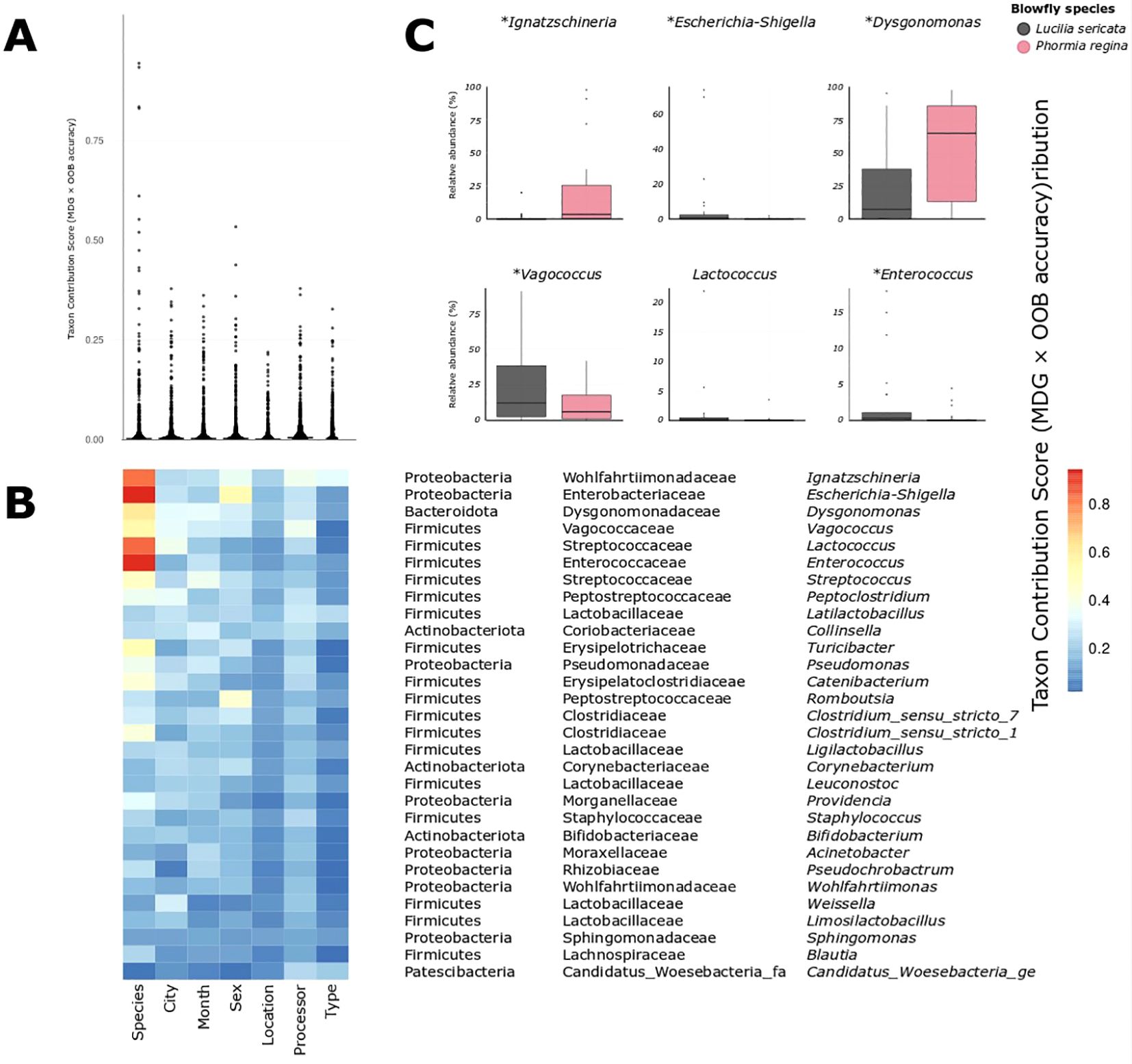 Figure 2. (A) Distribution of taxon contribution scores (Mean Decrease Gini × OOB accuracy, summed across all classifiers) for all bacterial taxa, grouped by metadata variable. Each point represents a taxon's importance for distinguishing a given metadata variable given in (B). (B) Heatmap showing the same taxon contribution scores for the top 30 most important taxa given in B. Every taxon shows its strongest signal under the "Species" classifier, supporting the unique explanatory power of species identity. (C) Relative abundance distributions for six of the most predictive genera (including Ignatzschineria, Dysgonomonas, Vagococcus, and Escherichia-Shigella), all of which differ between species. Asterisks denote statistically significant differences based on Tweedie GLM (p < 0.05).