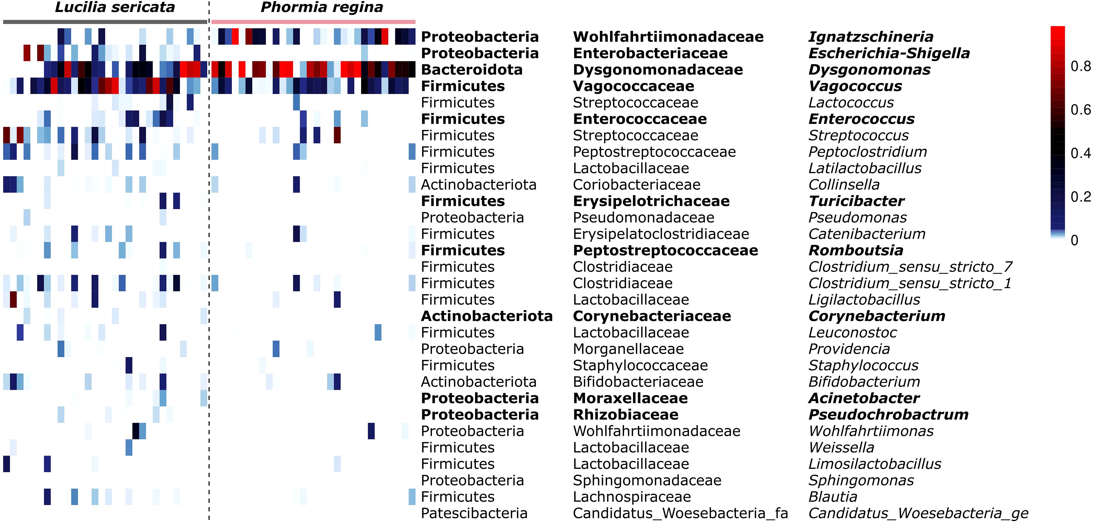 Heatmap comparing microbial communities in Lucilia sericata and Phormia regina. Bacterial families and genera are listed along the y-axis, with color intensity indicating abundance levels from blue (low) to red (high).