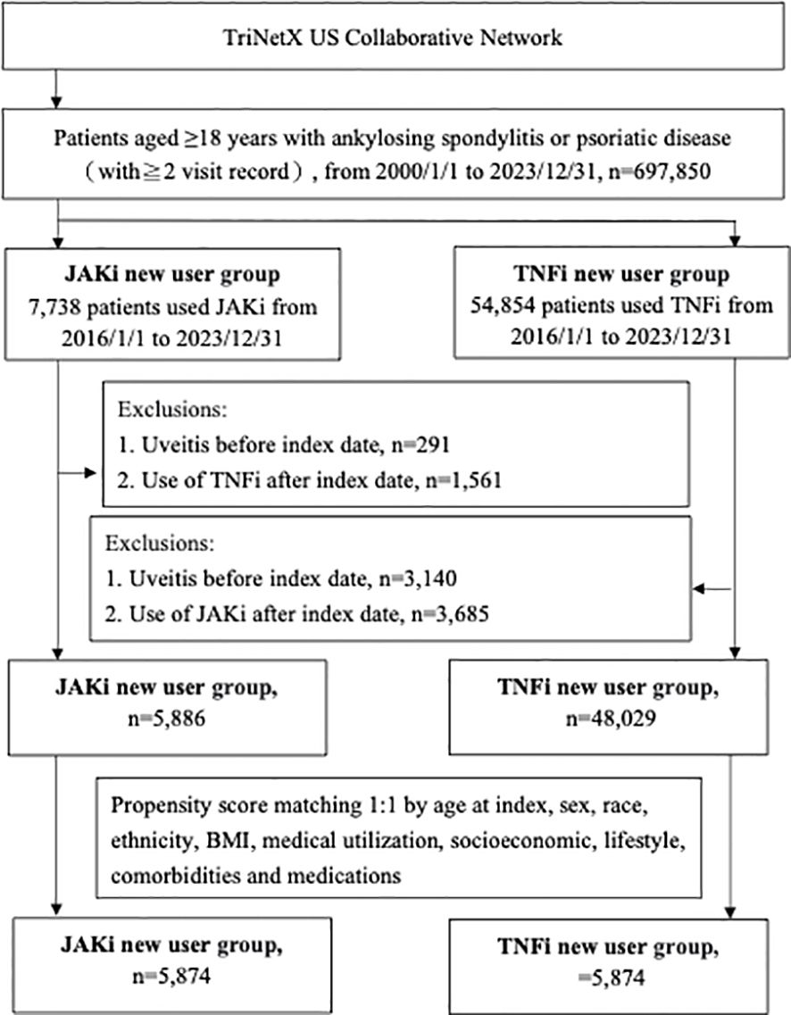 Despite their inclusion in treatment guidelines, comparative data on the relative effectiveness of TNFi and JAKi in reducing the risk of uveitis remain limited. Previous studies have established the efficacy of monoclonal antibody TNFi in preventing uveitis onset and reducing recurrence in patients with AS (12–15). In contrast, current evidence on JAKi largely stems from underpowered investigations, including case reports, small observational studies, and the prematurely terminated HUMBOLDT trial, all of which lack robust control groups (16–19). Recent safety concerns surrounding JAKi have further complicated therapeutic decision-making in clinical practice (20, 21). Moreover, it remains unclear whether the distinct immunologic mechanisms of TNFi and JAKi may differentially influence the risk of uveitis. These knowledge gaps underscore the urgent need for large-scale, head-to-head comparative studies evaluating the impact of these targeted therapies on uveitis risk.