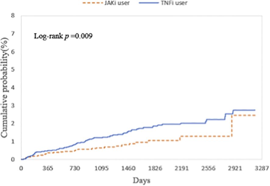 Figure 2. Kaplan-Meier curves showing the cumulative probability (%) of uveitis, comparing the risk of incident uveitis events in patients with autoimmune diseases treated with JAKi compared to TNFi over a 9-year follow-up period. JAKi, Janus kinase Inhibitors; TNFi, tumor necrosis factor-alpha inhibitors.