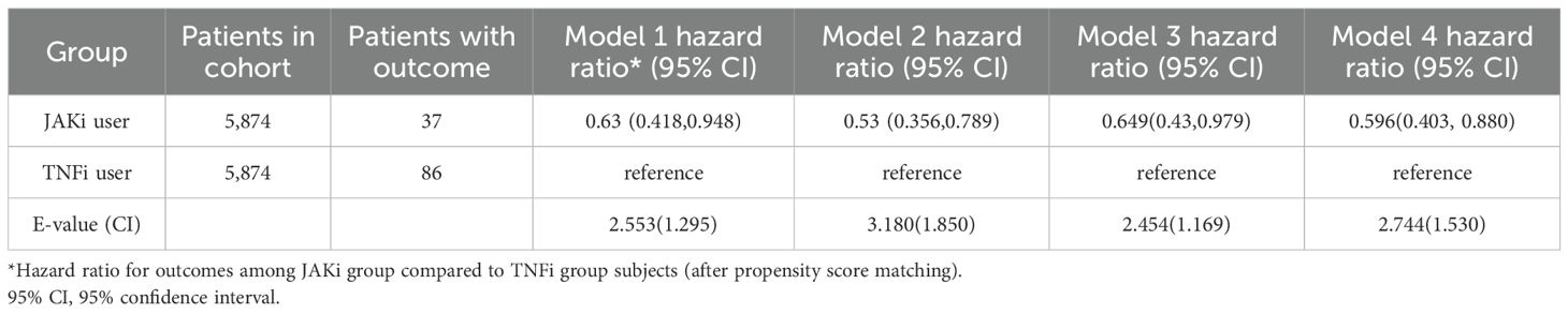 Baseline characteristics of eligible patients were extracted from the TriNetX database. Key demographic variables included age, sex, ethnicity, race, body mass index (BMI), socioeconomic status, and lifestyle factors. Pre-existing comorbidities identified in previous studies, as well as prior use of nonsteroidal anti-inflammatory drugs (NSAIDs) and conventional synthetic disease-modifying antirheumatic drugs (csDMARDs), were also recorded (28, 29). Laboratory markers, including C-reactive protein (CRP) and erythrocyte sedimentation rate (ESR), were considered potential confounders (30). Definitions of all variables are detailed in Supplementary Table 7. Exposure variables were defined using data from the 12-month period preceding the index date. To further evaluate the potential impact of unmeasured confounding, we calculated E-values for the association between JAKi use and incident uveitis.