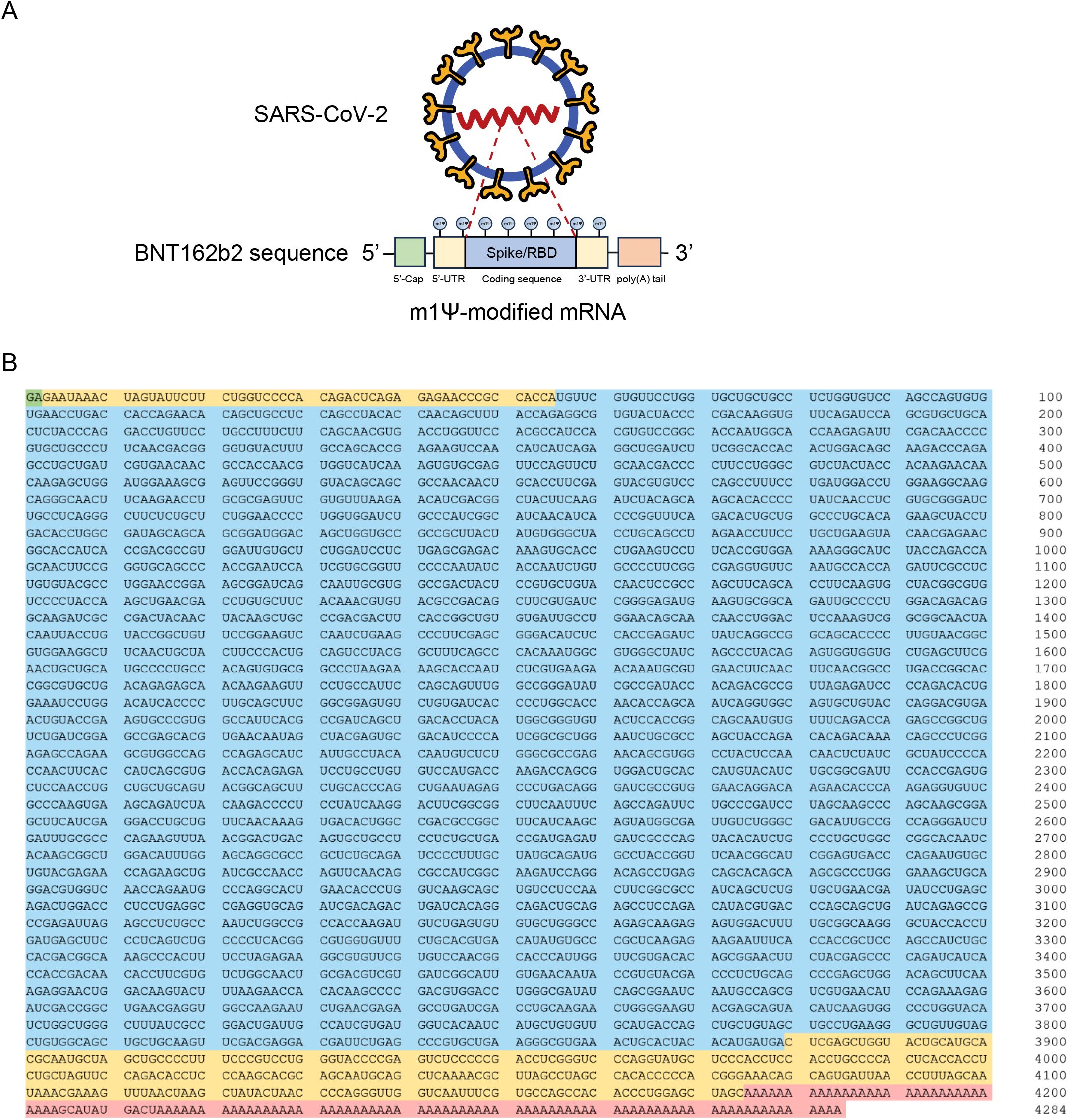 The sequence of the Pfizer-BioNTech COVID-19 mRNA vaccine (BNT162b2) has been previously disclosed (23). This 4284-nucleotide RNA construct comprises five key elements: 5’-cap, 5’ UTR, SARS-CoV-2 spike glycoprotein coding sequence, 3’ UTR, and poly(A) tail (Figures 1A, B).