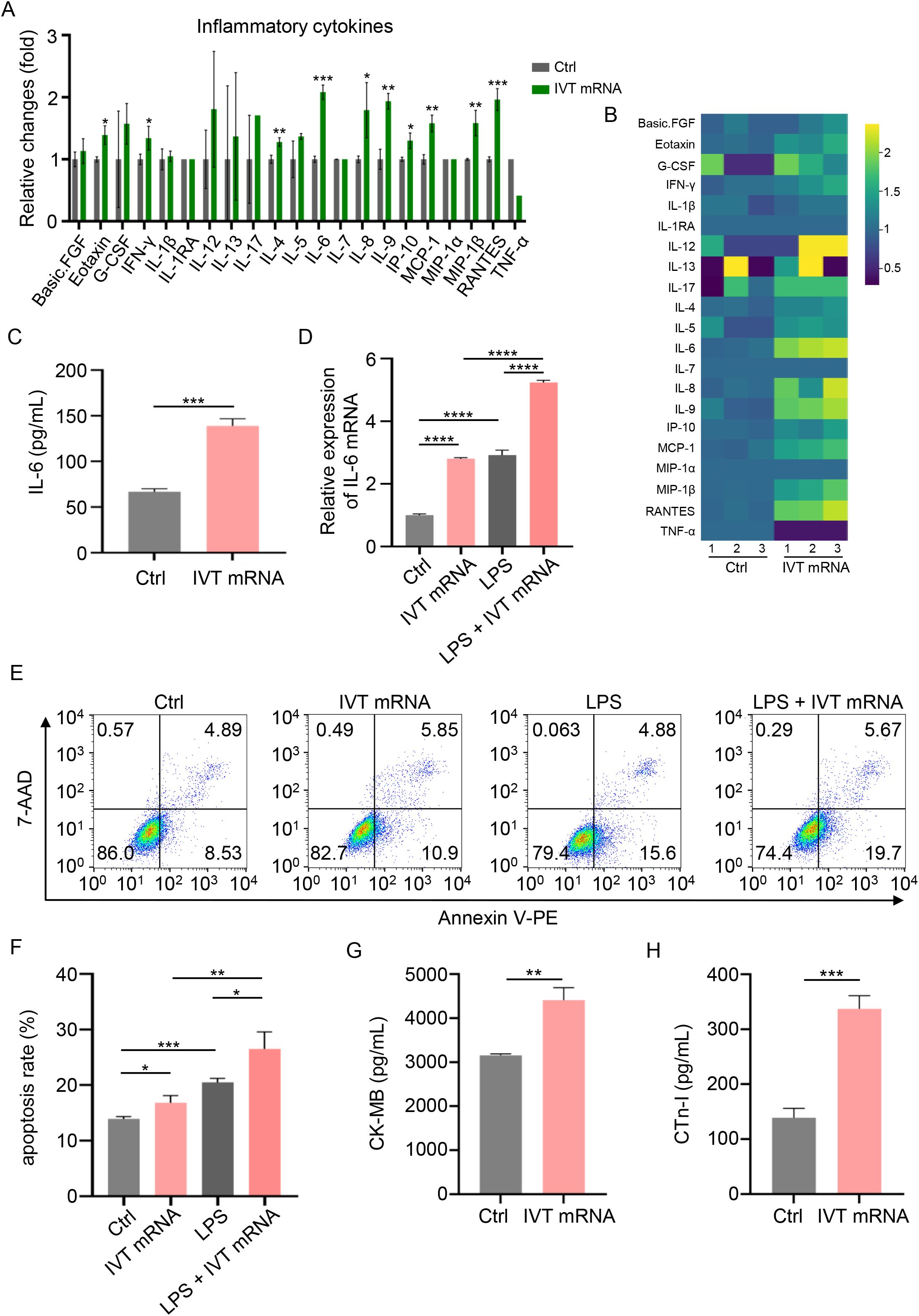 Figure 2. Inflammatory condition induced by IVT mRNA in AC16 cardiomyocytes. (A) Quantitative analysis of inflammatory cytokine production in the supernatant of cultured AC16 cardiomyocytes, assessed using a Luminex liquid suspension chip. (B) Heatmap of the production levels of the inflammatory cytokines in the cultured AC16 cardiomyocytes supernatant, assessed using a Luminex liquid suspension chip. (C) Quantification of IL-6 production levels in the same supernatant, determined by ELISA. (D) RT-qPCR analysis of IL-6 mRNA expression in AC16 cardiomyocytes stimulated with IVT mRNA, LPS, and LPS + IVT mRNA. (E, F) Quantitative analysis of the apoptosis rate in AC16 cardiomyocytes following treatment with IVT mRNA, LPS, and LPS + IVT mRNA. (G, H) Quantification of CK-MB, and cTn-I levels in the culture supernatant of AC16 cardiomyocytes, determined by ELISA. Statistical significance was determined using Student’s t test (A, C, G, H), and One-way ANOVA (D, F). *p < 0.05, **p < 0.01, ***p < 0.001, ****p < 0.0001 versus the control (Ctrl) group. The experiments were performed in triplicates, and data are presented as n = 3, mean ± SD.