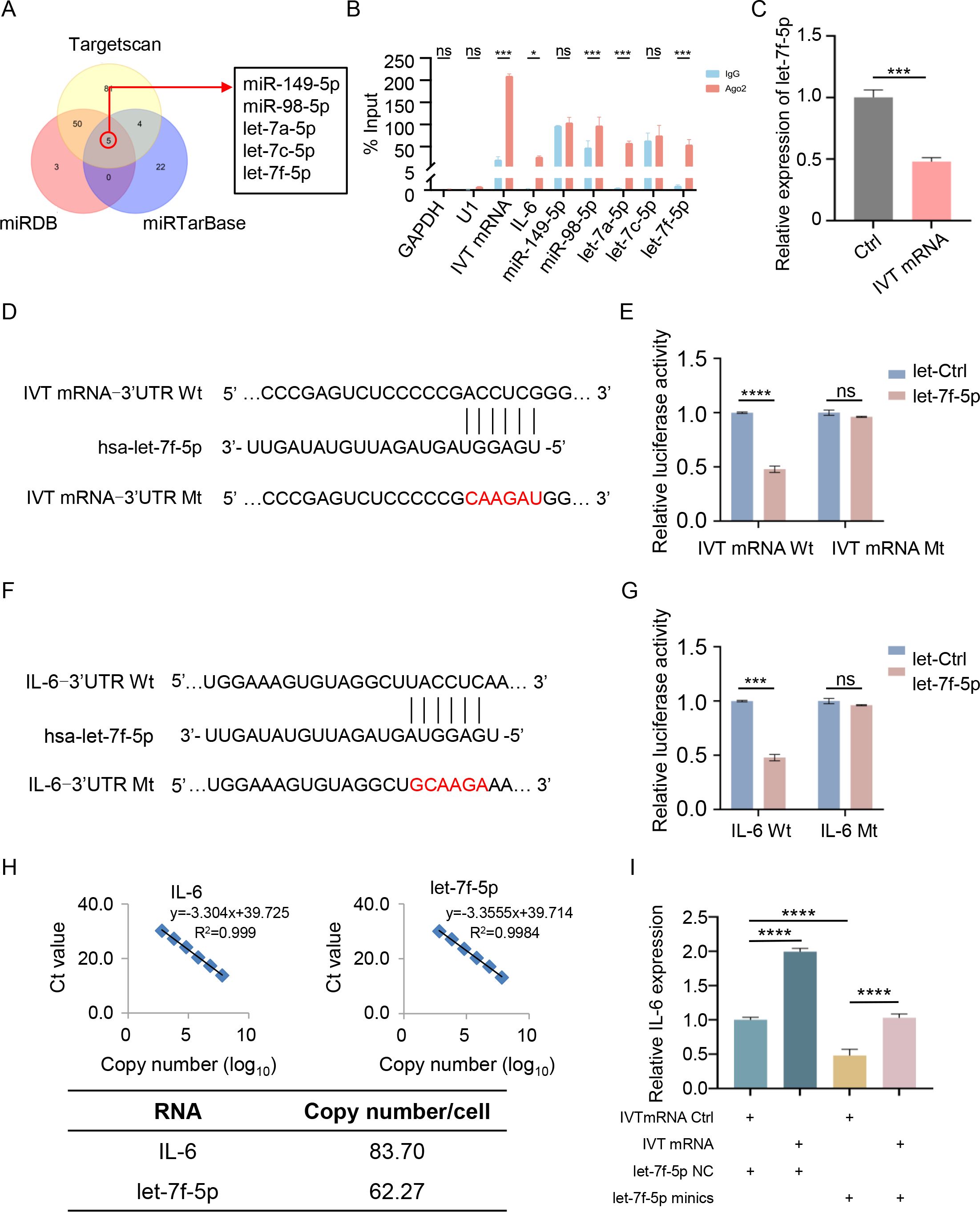 Diagram showing multiple panels related to microRNA research.   Panel A: Venn diagram comparing target predictions from databases miRDB, TargetScan, and miRTarBase. Panel B: Bar graph illustrating percentage input of various miRNAs, with statistical significance denoted. Panel C: Bar graph comparing relative expression of let-7f-5p between control and IVT mRNA. Panel D: Sequence alignment showing interactions between hsa-let-7f-5p and IVT mRNA with highlighted mutations. Panel E: Bar graph displaying relative luciferase activity for let-Ctrl and let-7f-5p with wild-type and mutated IVT mRNA. Panel F: Sequence alignment for IL-6-3’UTR, showing interactions with let-7f-5p and highlighted mutations. Panel G: Bar graph of relative luciferase activity for IL-6 with let-Ctrl and let-7f-5p, with statistical significance marked. Panel H: Line graphs of Ct values for IL-6 and let-7f-5p, accompanied by RNA copy number table. Panel I: Bar graph showing relative IL-6 expression under various conditions with statistical significance indicated.
