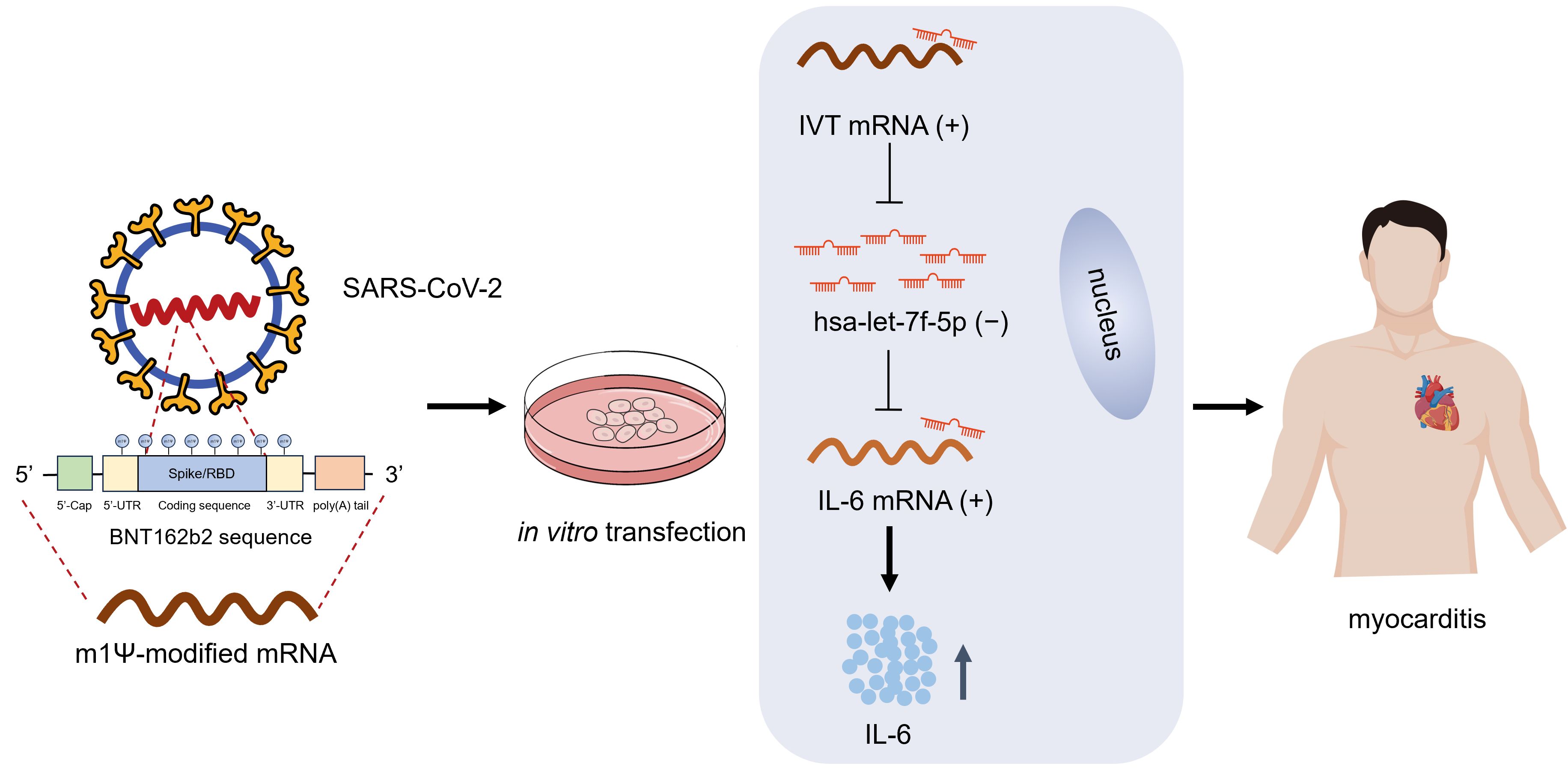Discussion: This study elucidated a molecular mechanism linking COVID-19 mRNA vaccines to myocarditis and highlighted the ceRNA-mediated crosstalk between IVT mRNA and IL-6. These findings underscore the importance of avoiding critical microRNA binding sites in the design of next-generation mRNA vaccine sequences to improve safety.