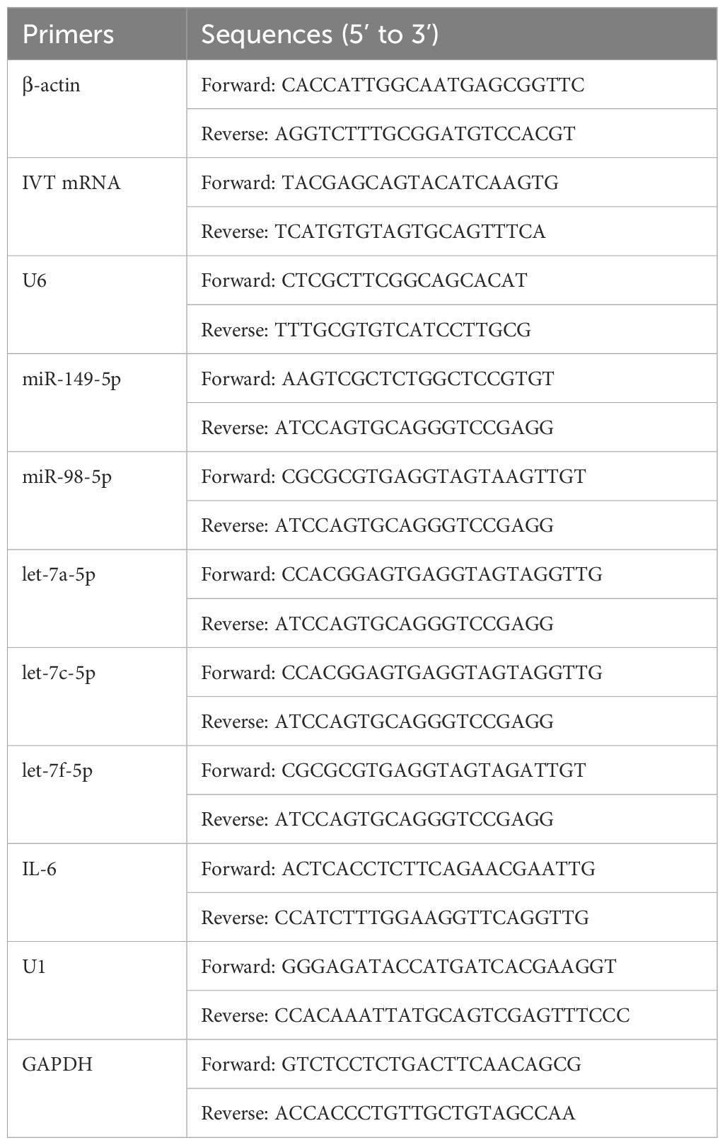 miR-98-5p: GTCGTATCCAGTGCAGGGTCCGAGGTATTCGCACTGGATACGACAACAAT; let-7a-5p: GTCGTATCCAGTGCAGGGTCCGAGGTATTCGCACTGGATACGACAACTAT;