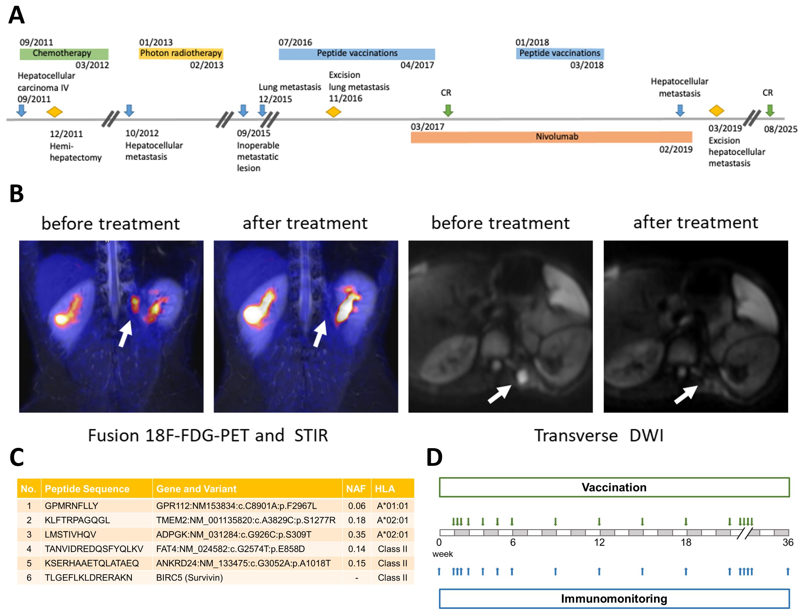 Figure 1. Overview of clinical course, representative imaging, peptide selection and vaccination/immunomonitoring schedule: (A) Timeline of the patient’s clinical course, including initial diagnosis, relapses, surgical interventions, and immunotherapy. Blue arrows indicate key events related to the malignancy: initial HCC diagnosis, first relapse (paravertebral metastasis), second relapse (local recurrence arising from residual tumor mass), third relapse (lung metastasis), and fourth relapse (paravertebral recurrence in the M.erector spinae). Yellow diamonds mark surgical interventions: initial hemi-hepatectomy, partial diaphragmic resection, and resection of the paravertebral lesion. Green arrows indicate complete remission (CR). Treatment periods are represented by colored bars: chemotherapy (green), photon radiotherapy (yellow), peptide vaccination (blue), and Nivolumab therapy (orange). (B) Imaging before and after treatment. Left: fusion 18F-FDG-PET and short tau inversion recovery (STIR) images. Right: transverse diffusion-weighted imaging (DWI). White arrows highlight tumor sites. Imaging demonstrates reduced metabolic activity and resolution of lesions following therapy. (C) Selected peptides for the vaccine cocktail, with corresponding peptide sequences, associated genes and variants, novel allele frequencies (NAF), and HLA restrictions. Five peptides were derived from tumor-specific mutations; a sixth peptide, derived from the wild-type antigen Survivin, served as control. (D) Schedule of peptide vaccinations (green arrows) and blood sampling for immunomonitoring (blue arrows) during the first vaccination cycle.