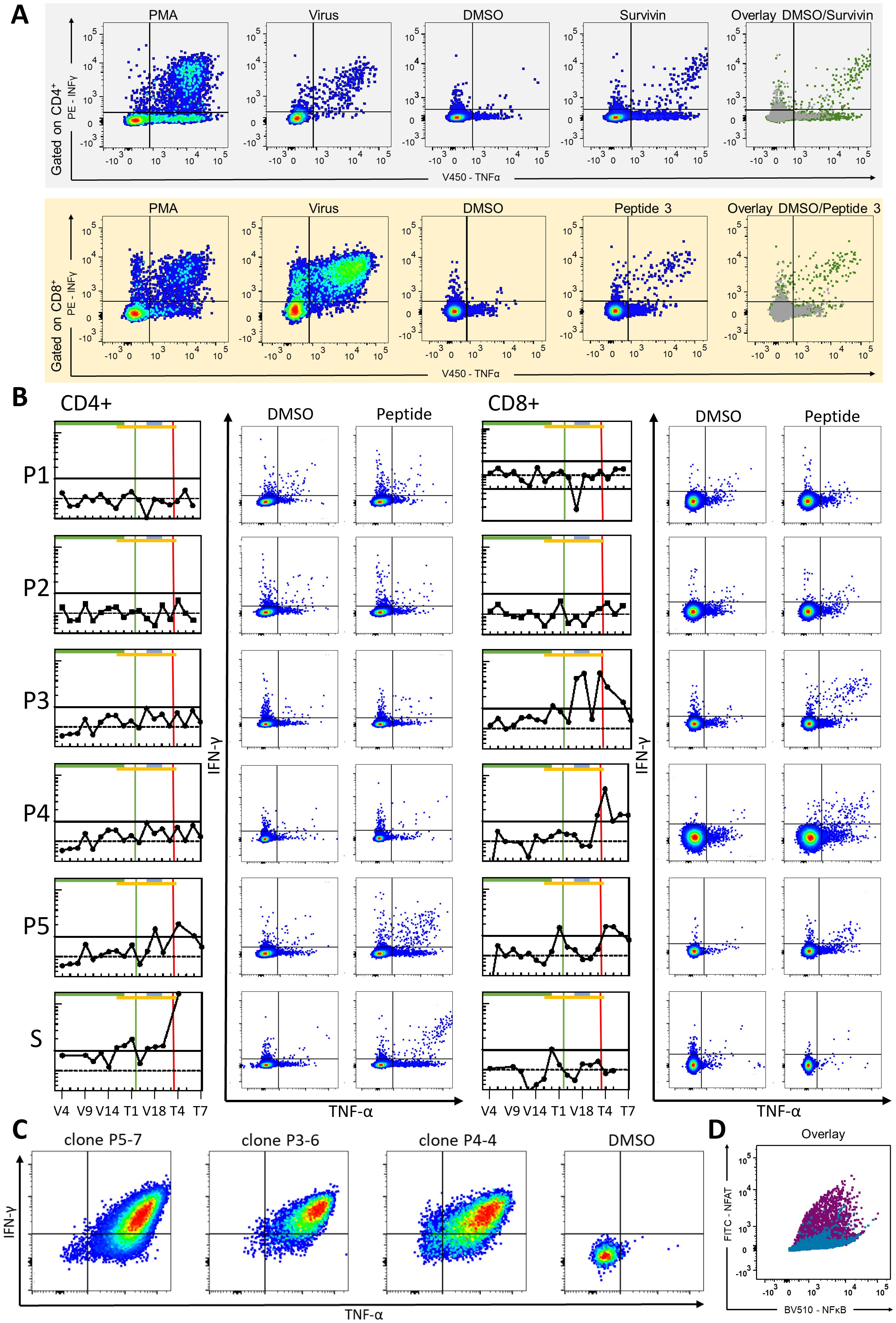 Figure 2. Gating strategy, vaccine-specific t-cell responses and T-cell clone evaluation and TCR validation: (A) Representative FACS plots of CD4+ (upper row) and CD8+ (lower row) T-cell responses displaying IFN-γ (y-axis) and TNF-α (x-axis) expression. Sample columns, from left to right, display the following: positive control (PMA/Ionomycin), recall antigen (virus), negative control (DMSO), peptide-stimulated (peptide 3), and overlay of the negative control (gray) and peptide-stimulated sample (green). (B) Vaccine-specific T-cell responses over the course of vaccination. FACS ICS readout values were transformed into pooled ASI values for each analyzed time point and peptide. Each peptide-specific graph depicts CD4+ responses on the left and CD8+ responses on the right. Ticks on the x-axes indicate the patient’s visits according to the vaccination protocol and follow-up schedule; only selected time points are labeled in the bottom row as representative examples of the immunomonitoring timeline: From left to right: V4, V5, V6, V9, V12, V13, V14, V15, V16 (1st Vaccination); T1, T2, V17, V18, V19, T6, T7, T8, T9, T10 (while V17-V19 encompass the second Vaccination cycle). Y-axes ticks show pooled ASI values (logarithmic scale), with a dotted horizontal line at pooled ASI value = 1 (no difference between peptide-stimulated sample and negative control samples) and a bold horizontal line at pooled ASI = 2 indicating at least a twofold increase relative to the negative control. The bottom column “S” represents responses to the WT control peptide (Survivin). Horizontal bars denote treatment phases: first vaccination cycle (green), CPI therapy (orange), and second vaccination cycle (gray). Vertical lines indicate complete remission (CR, green) and fourth recurrence (red). Example FACS plots show DMSO vs. peptide-stimulated IFN-γ and TNF-α double positive T-cells. (C) FACS-based evaluation of T-cell clones (P5-7, P3-6, P4-4) specific for peptide 3. Example FACS plots show DMSO vs. peptide-stimulated IFN-γ and TNF-α double-positive T-cells. (D) Functional validation of the clonally expanded TCR (P4-4/P5-7), re-expressed in a Jurkat-based triple-reporter cell line using orthotopic TCR replacement (OTR). Reporter activation upon stimulation with HLA-A*02:01+ antigen-presenting cells pulsed with the vaccine peptide (purple) or an A2-restricted control peptide (blue-green). Overlay of NFκB (x-axis) and NFAT (y-axis) reporter signals illustrates selective activation in response to the vaccine peptide.