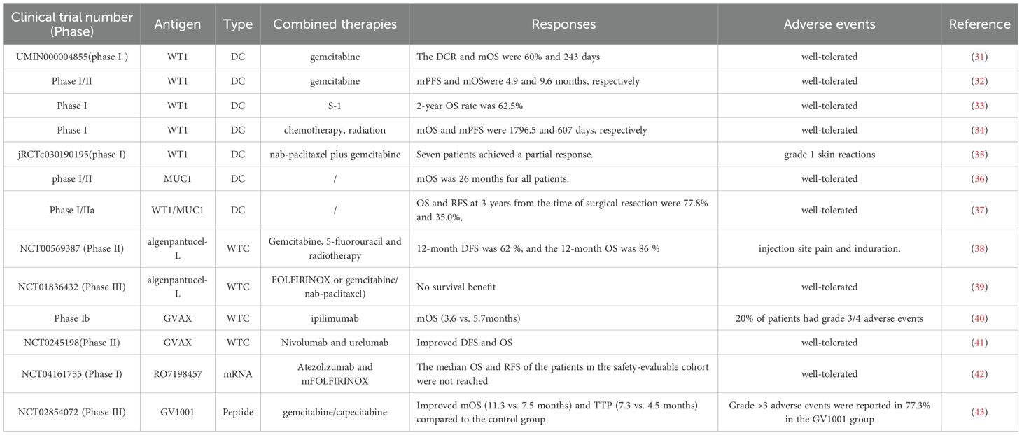 Cell-based cancer vaccines utilize the patient’s own immune cells, particularly DCs, to process both soluble and particulate antigens (44). Additionally, tumor cells are recognized as valuable antigen sources for vaccines, presented in multiple formats, including whole tumor cells (WTC) and tumor cell lysates (45). Both DC and WTC-based vaccines are evaluated in the clinical trials of pancreatic cancer. DCs play a crucial role in the immune system by effectively presenting both exogenous and endogenous antigens to T cells, thereby triggering adoptive immune responses (46). By showcasing tumor-specific antigens, DCs can trigger the generation of cytotoxic T lymphocytes that specifically recognize and destroy cancer cells (47). DCs are specialized APCs that are highly effective in generating robust immune responses and maintaining tolerance to self or benign foreign antigens, making DCs an appealing tool for developing immunotherapeutic strategies (48). Since the study has assessed the efficacy of DCs pulsed with melanoma-associated antigen (MAGE) 1 for treating melanoma patients, emerging evidence has demonstrated treatments based on DCs are safe, even in patients with advanced cancer (49). Additionally, DC-based therapies can enhance immune responses that lead to sustained remissions, providing optimism for enduring outcomes (50). The Wilms’ tumor 1 (WT1) antigen has been recognized as a highly effective target in various cancer types, including pancreatic cancer (51). WT1-peptide pulsed dendritic cell (WT1-DC) vaccine combined with gemcitabine chemotherapy resulted in durable specific T cell immune responses, which were associated with significant improvements in survival in advanced PDAC patients (31–35). Further studies broadened the insights into the potential clinical application of WT1-DC vaccines as evidenced by vaccine injection combined with chemotherapy exhibited safety and effectiveness in resected PDAC patients (52). And WT1-DC vaccine in conjunction with multimodal treatments including chemotherapy, irradiation and surgery was related with longer overall survival time (53). Moreover, the chemoimmunotherapy regimen consisted of nab-paclitaxel plus gemcitabine combined with WT1-DC vaccination regulated TME and facilitated conversion surgery for advanced pancreatic cancer patients (54). A chemoimmunotherapy approach combining a WT1−DC vaccine with multi−agent chemotherapy was observed to reprogram the TME toward an immunostimulatory phenotype, permitting conversion surgery in 7 of 9 patients with unresectable pancreatic ductal adenocarcinoma (55). Although early observations are encouraging and informative, definitive clarification of the treatment effect attributable to WT1−targeted chemoimmunotherapy will require large, well−controlled studies with appropriate comparators (55).