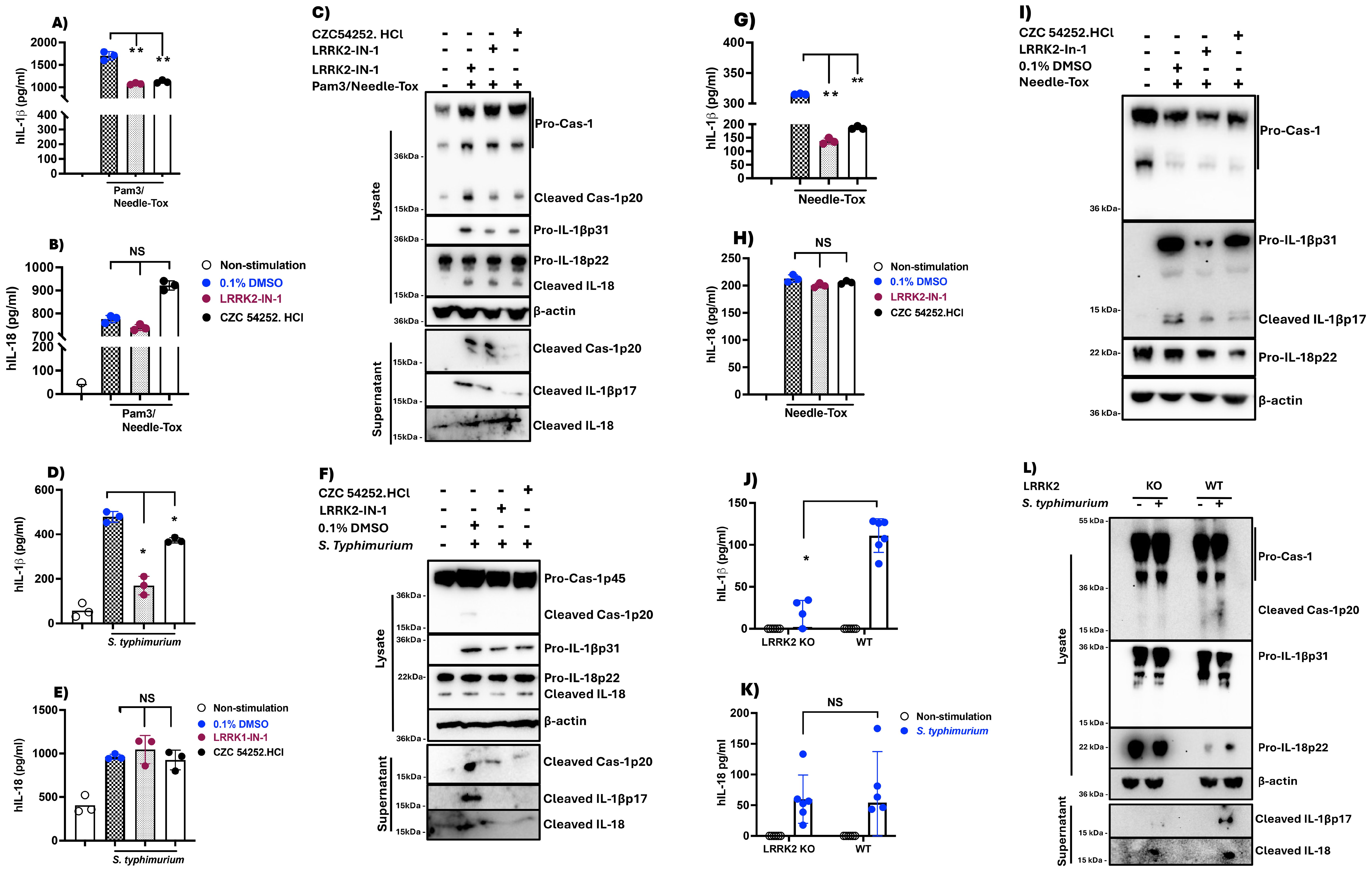 Figure 1. LRRK2-kinase inhibitors suppress IL-1β but not IL-18 generation in human PB-DCs. PBMC-derived dendritic cells, generated over 6 days as described in Methods, were harvested on day 7 and adjusted to a concentration of 1x106 cells/ml. Cells were placed in 12-well culture plates at 1ml/well. The next morning, the media was replaced with fresh, complete RPMI media containing 0.1% DMSO alone or one of two LRRK2 inhibitors, LRRK2-IN-1 and CZC 54252.HCl at a concentration of 5 µM and treated for 60 minutes. Subsequently, cells were stimulated with TLR ligands and/or various NLRC4 ligands (or S. typhimurium) were added to the culture sequentially to obtain the indicated concentration for various lengths of time, after which culture supernatants were harvested and assayed for IL-1β and IL-18 levels by ELISA. Cell lysates derived from cells at the termination of treatment were subjected to immunoblot analysis using the indicated antibodies. (A-C) Pam3CSK4 (100 ng/ml, 3h), followed by Needle-tox (1 µg/ml, 30 minutes) was added to the culture; (D-F) Salmonella typhimurium (MOI-1, 4 h); (G-I) Needle-tox (1 µg/ml, 4h). (J-L) Human PBMC-derived dendritic cells were subjected to LRRK2 KO via CRISPR/Cas9 editing facilitated by lentivirus transduction as described in Methods and were cultured as indicated above with Salmonella typhimurium (MOI-1, 4 h). Blue dots indicate 0.1% DMSO + stimulant, Dark brown indicates LRRK2-IN-1+stimulant, and Black indicates CZC 54252.HCl. + stimulant. Data are shown as means ± SEM; *,P< 0.05; **,P< 0.01; ***,P< 0.0001; ****, P<0.00001; as determined by Student’s t-test. All conditions were tested in triplicate; in each panel, the data shown represent at least three (3) independent experiments.