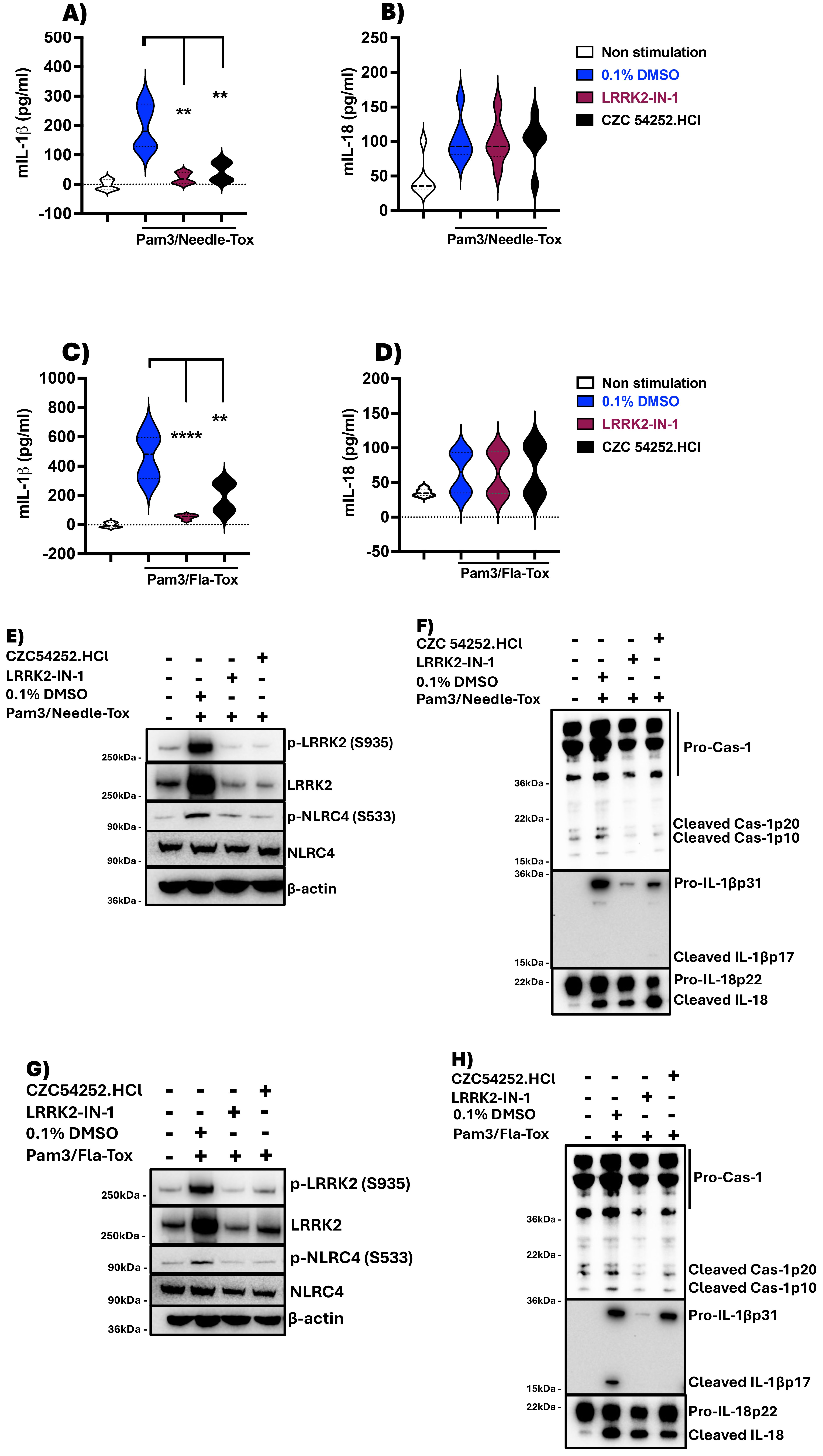 Figure 2. LRRK2-kinase inhibitors suppress IL-1β but not IL-18 production in murine BMDCs. Mouse BMDCs were generated over 6 days as described in Methods, harvested on day 7, and adjusted to a concentration of 1x106 cells/ml. Cells were placed in a 12-well culture plate at 1ml/well. The next morning, the media was replaced with fresh, complete RPMI media containing 0.1% DMSO alone or one of two LRRK2 inhibitors, LRRK2-IN-1 and CZC 54252.HCl at a concentration of 5 µM and treated for 60 minutes; subsequently, various TLR ligands and/or various NLRC4 ligands were added to the culture sequentially to obtain the indicated concentration for various lengths of time, after which culture supernatants were harvested and assayed for IL-1β and IL-18 levels by ELISA. (A, B) Pam3CSK4 (100 ng/ml, 3h) followed by Needle-Tox (1 µg/ml, 30 minutes); (C, D) Pam3CSK4 followed by Fla-Tox (1 µg/ml for 60 minutes). (E-H) Cell lysates derived from cells at the termination of culture, which had been treated as described in (A-D), were subjected to immunoblotting with the indicated antibodies. Blue violins indicate 0.1% DMSO + stimulant, Dark brown violins indicate LRRK2-IN-1+ stimulant, and Black violins indicate CZC 54252.HCl.+ stimulant. Data in (A-D) are shown as means ± SEM; *,P< 0.05; **,P< 0.01; ***,P< 0.0001; ****, P<0.00001; as determined by Student’s t-test. All conditions were tested in triplicate; in each panel, the data shown represent at least two independent experiments.