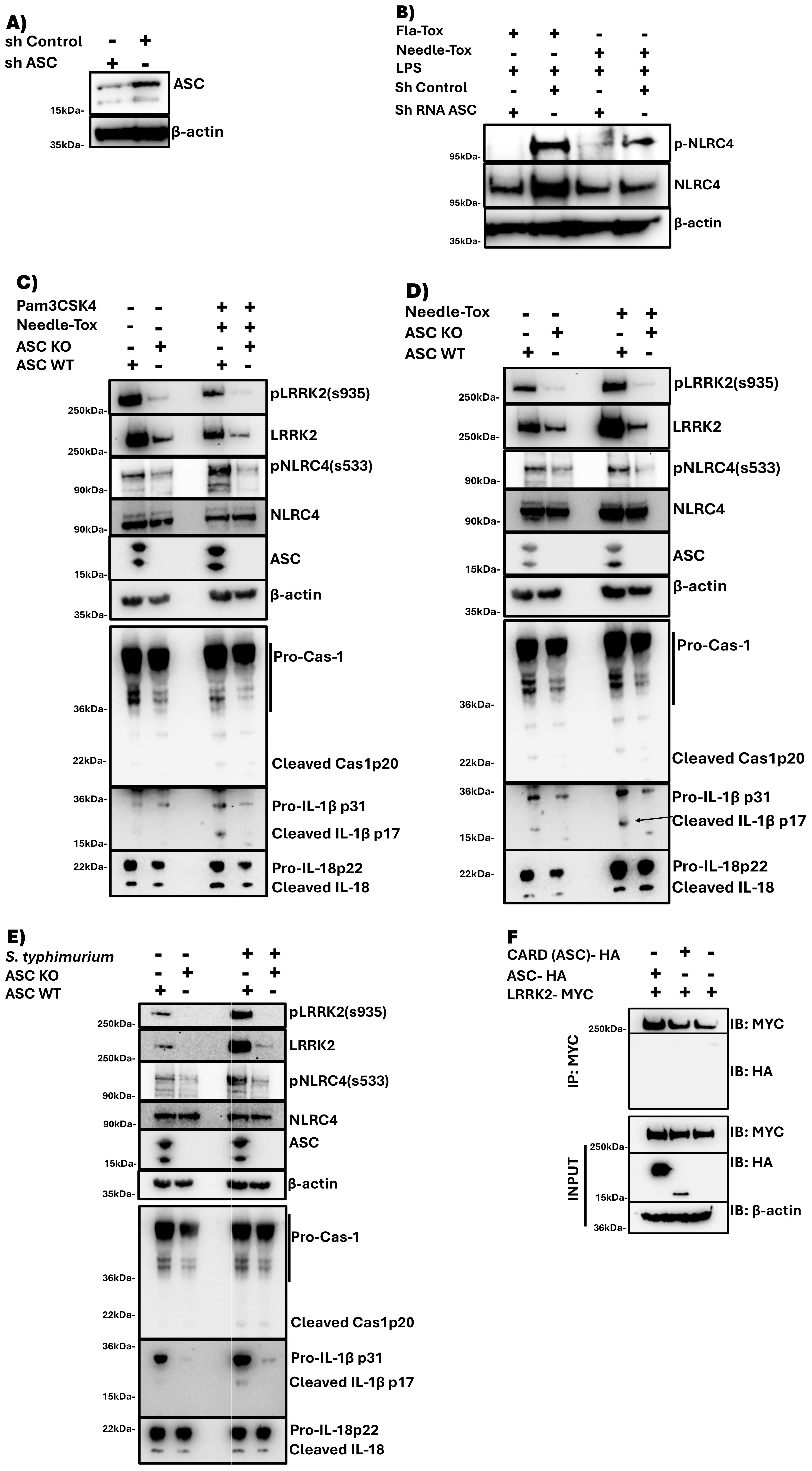 Figure 3. NLRC4 phosphorylation requires ASC incorporation into the NLRC4 inflammasome. (A, B) PBMC-derived DCs were subjected to ASC KD or sham KD by transfection with shRNA targeting ASC or scrambled shRNA, and cultured at 1×10^6/ml with LPS (200 ng/ml, 3 h) and Needle-Tox (1 μg/ml, 30 min). Afterward, cell lysates were obtained and subjected to immunoblotting as indicated. (C-E) ASC KO and WT THP-1 cells (1×10^6/ml) were separately cultured alone or with Pam3CSK4 (100 ng/ml, 3 h), followed by Needle-Tox (1 μg/ml, 30 min) (C), with Needle-Tox (1 μg/ml, 3 h) alone (D), or with S. typhimurium (MOI 1, 4 h) (E). Afterward, cell lysates were collected and subjected to immunoblotting as indicated. (F) HEK293t cells were transfected with plasmids expressing MYC-tagged LRRK2, with or without co-transfection of plasmids expressing HA-tagged WT full-length ASC or ASCCARD domain. After 24 hours, cell lysates were obtained and subjected to immunoprecipitation with anti-MYC antibody, followed by immunoblotting with the indicated antibodies. All the above data are representative of at least two independent experiments.