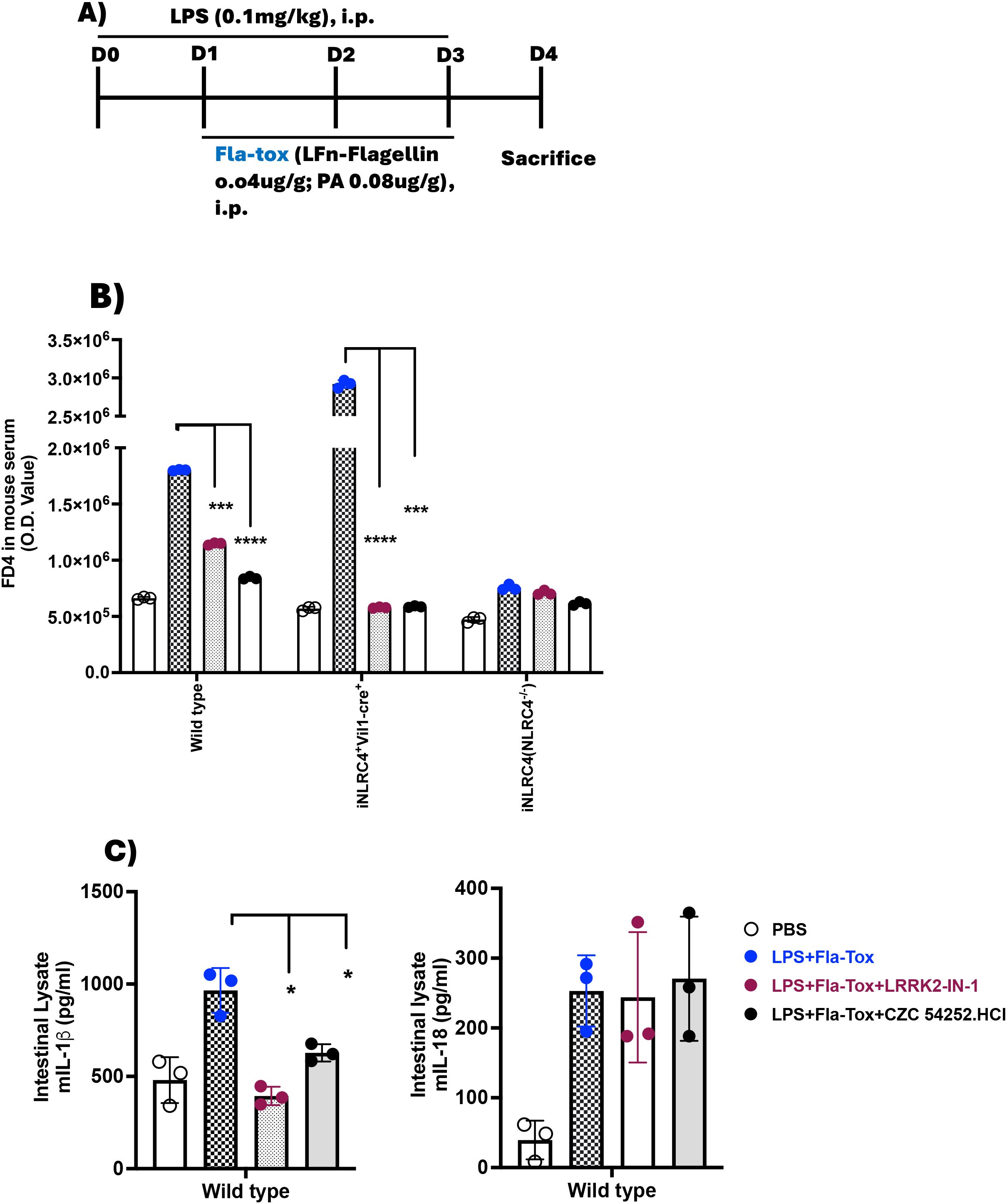 Figure 6. Increased Intestinal permeability induced by NLRC4 inflammasome activation is suppressed by LRRK2 inhibitors. (A) 8–10 week-old C57BL/6 WT, in-house iNLRC4+Vil1-cre+ (NLRC4 present only in epithelial cells), and NLRC4-/- (iNLRC4) mice (n=3 per group) were administered PBS, LPS, Fla-Tox, and LRRK2 inhibitors CZC54252 and LRRK2-IN-1 at a dose of 5 mg/kg via intraperitoneal injection on days 0-3, following the protocol shown; (B) On day 4, mice were fasted for one hour, then given FD4 by gavage (10 mg/ml, 150 µl/mouse). After one hour, mice were euthanized to collect blood and intestinal tissue; the FD4 concentration in the blood serum was measured by fluorescence. Serum was pooled, and FD4 fluorescence was recorded. (C) Right Panel: IL-1β; Left Panel: IL-18. The entire intestine from mice treated according to the described protocol was homogenized, centrifuged, and the clear lysates were used to measure IL-1β and IL-18 levels by ELISA. Each dot represents one mouse. Blue dots indicate LPS+ Fla-Tox, Dark brown dots indicate LPS+ Fla-Tox + LRRK2-IN-1 and Black dots indicate LPS+ Fla-Tox +CZC 54252.HCl. Data are expressed as means ± SEM;*,P < 0.05; **,P < 0.01; ***, P< 0.0001; ****, P<0.00001; Both Student’s t-test or one-way ANOVA determined significance. All conditions were performed in triplicate. In each panel, data are from at least two independent experiments.