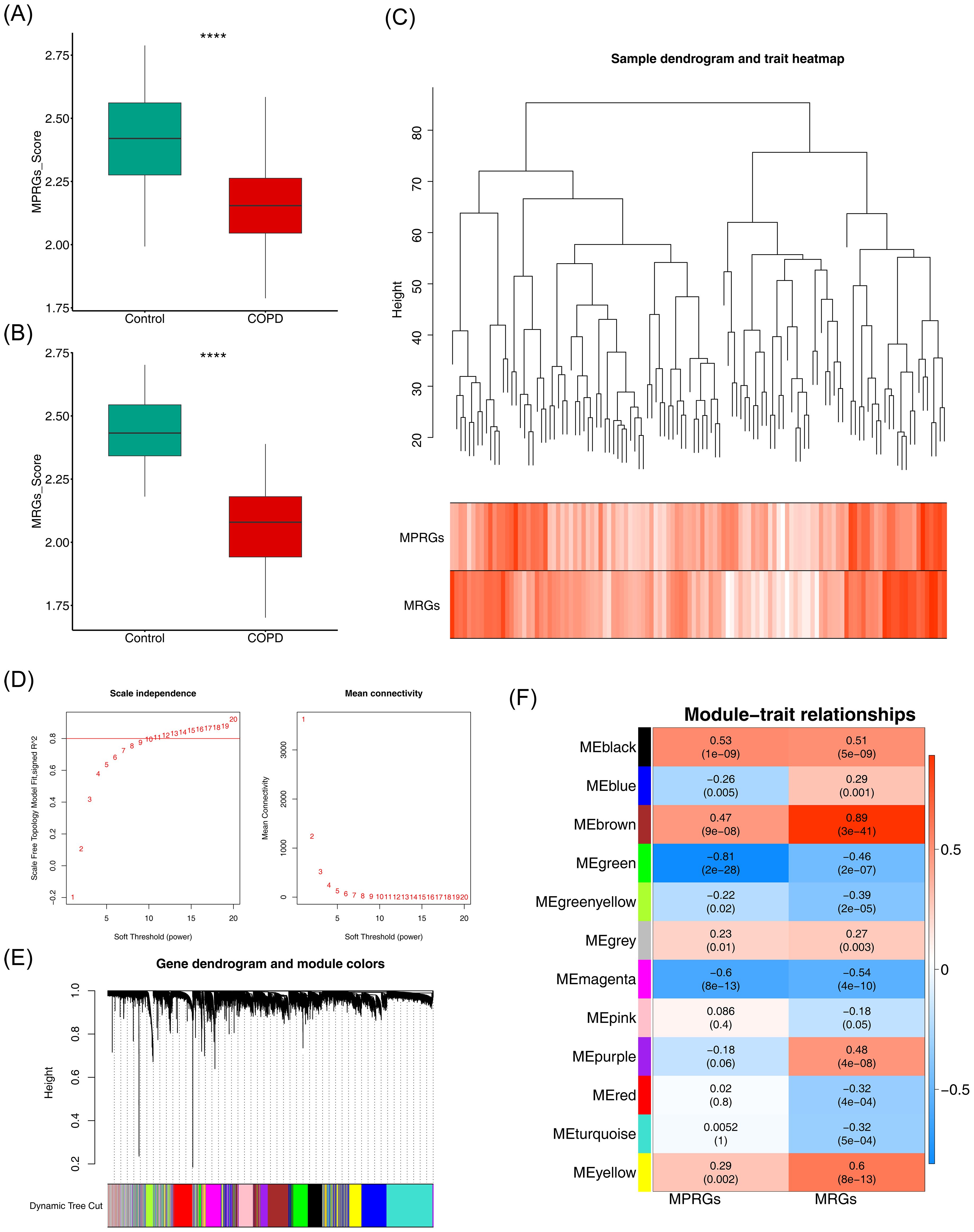 Figure 1. Identification of mitochondria and macrophage polarization-related module genes. (A, B) Box plots of intergroup differences in MRGs score and MPRGs score. ****, p<0.0001. (C) Hierarchical clustering plot of samples. Branches represent samples, and the ordinate represents the height of hierarchical clustering. (D) Soft thresholding filtering results. (E) Module dynamic cutting Tree. (F) Heatmap of correlation between modules and core traits.