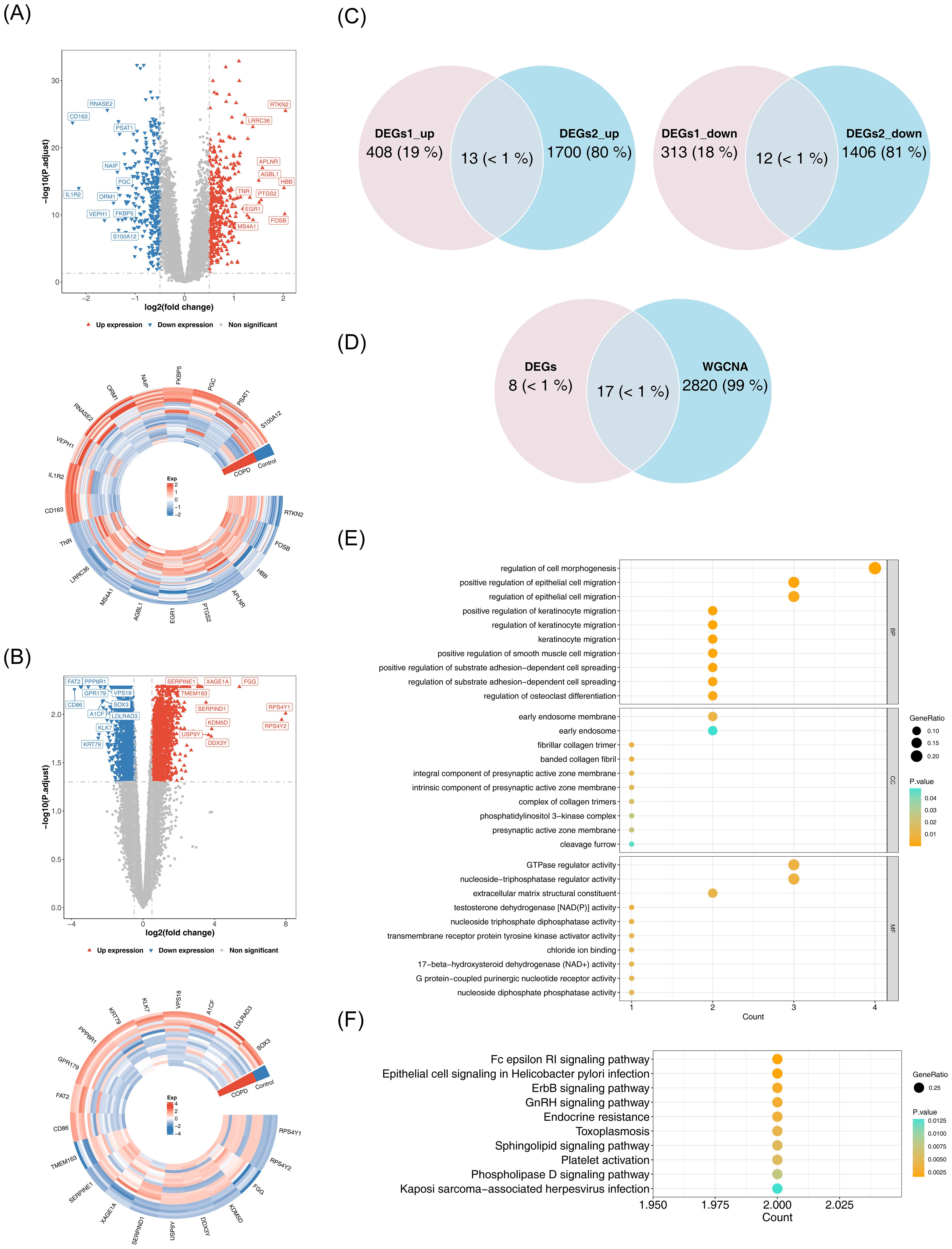 Figure 2. Identification and functional analysis of candidate genes. (A) Volcano plot and heatmap of differential analysis. Left panel: Red upward triangles represent upregulated differentially expressed genes; blue downward triangles represent downregulated genes; gray points indicate non-significant genes. Right panel: Gene names are labeled outside the circle. Colors indicate normalized gene expression levels: red indicates high expression, blue indicates low expression. (B) Volcano plot and heatmap of differential analysis. Left panel: Red upward triangles represent upregulated differentially expressed genes; blue downward triangles represent downregulated genes; gray points indicate non-significant genes. Right panel: Gene names are labeled outside the circle. Colors indicate normalized gene expression levels: red indicates high expression, blue indicates low expression. (C) Venn diagram illustrating the intersection of DEGs1 and DEGs2. (D) Venn diagram for candidate gene identification. (E) GO enrichment analysis. The horizontal axis represents the number of enriched genes, the vertical axis shows the term names, and the color of the dots indicates the significance level. (F) KEGG enrichment analysis.