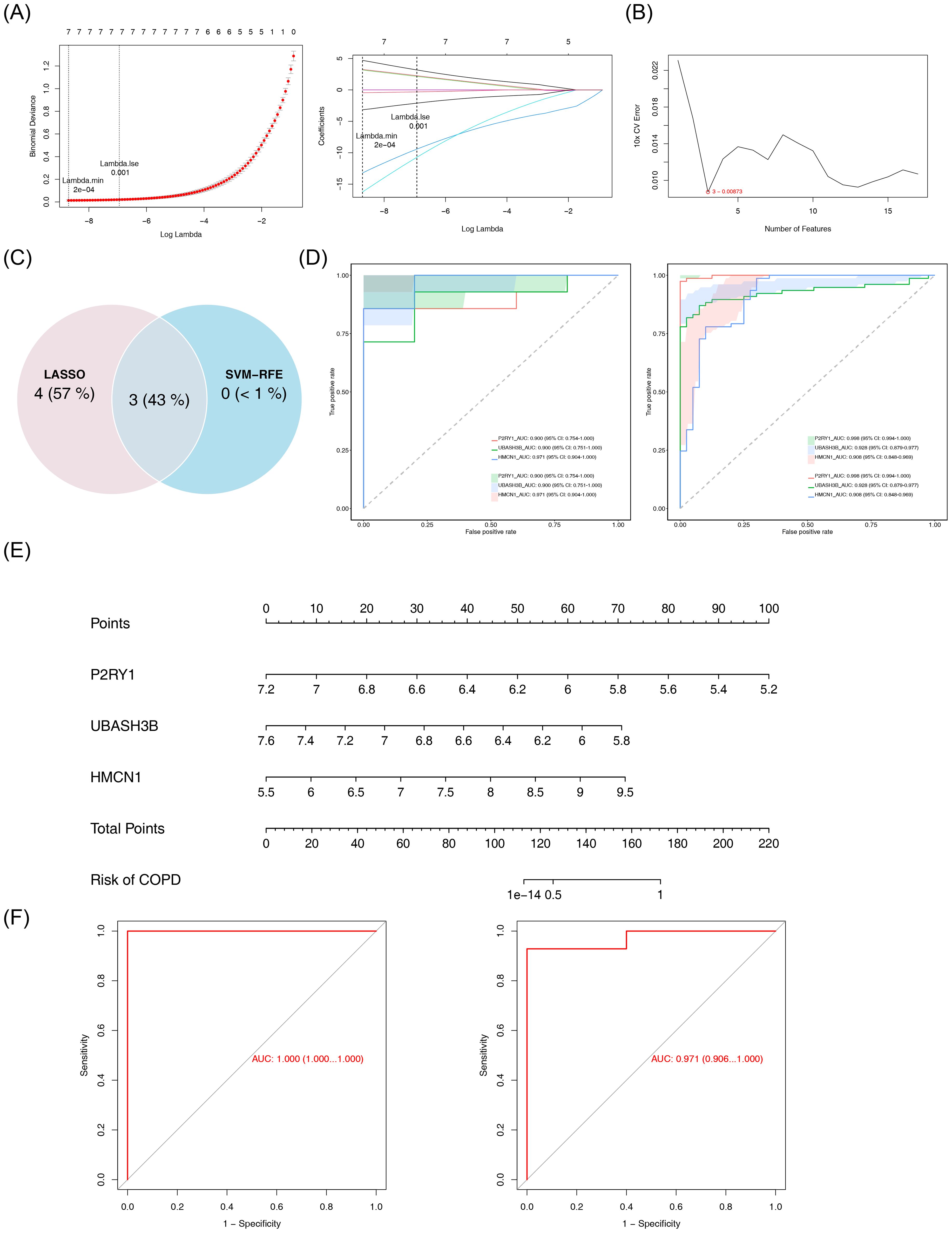 Machine learning was used to identify candidate biomarkers. In LASSO analysis, with a Lambda.min of 2e-04, seven signature genes were selected: HMCN1, KLF10, CHN1, P2RY1, UBASH3B, DOCK5, and SIGLEC16 (Figure 3A). SVM-RFE analysis, with an error rate of 0.00873, selected three signature genes: P2RY1, UBASH3B, and HMCN1 (Figure 3B). Overlapping these results led to the identification of three candidate biomarkers (Figure 3C). ROC analysis showed AUC values greater than 0.9 for the three biomarkers (Figure 3D), indicating their strong ability to distinguish between COPD and control samples. These biomarkers were thus considered reliable for further analysis. A nomogram for the biomarkers was constructed (Figure 3E). Furthermore, the ROC curve of the model revealed AUC values exceeding 0.9 (Figure 3F), demonstrating excellent predictive performance and generalizability.