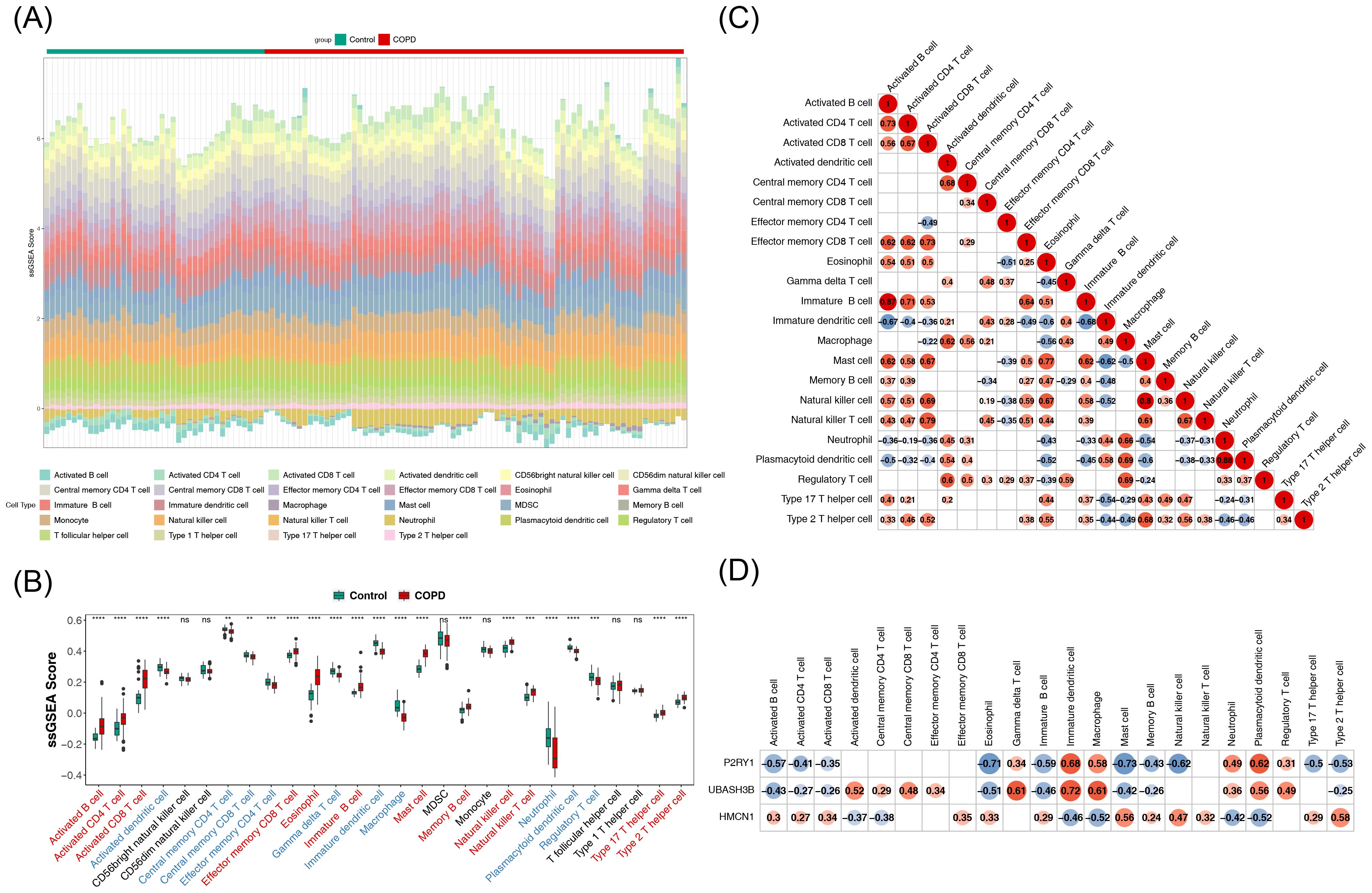 The impact of biomarkers on the immune microenvironment was further explored. Figure 4A illustrates the proportion of 28 immune cell types infiltrated in COPD and control samples. Among these, 22 immune cell types showed significant differences between COPD and control samples. Specifically, activated B cells, activated CD4 T cells, and activated CD8 T cells exhibited significantly higher infiltration levels in the COPD group, whereas central memory CD4 T cells, central memory CD8 T cells, and effector memory CD4 T cells showed notably lower infiltration levels (Figure 4B). Correlation analysis revealed the highest positive correlation between plasmacytoid dendritic cells and neutrophils (r = 0.88, p < 0.05), while the highest negative correlation was observed between immature dendritic cells and immature B cells (r = -0.68, p < 0.05) (Figure 4C). Furthermore, UBASH3B demonstrated the strongest positive correlation with immature dendritic cells (r = 0.72, p < 0.05), and P2RY1 exhibited the strongest negative correlation with eosinophils (r = -0.71, p < 0.05) (Figure 4D). These results suggest that the biomarkers may influence COPD through immune cell interactions.