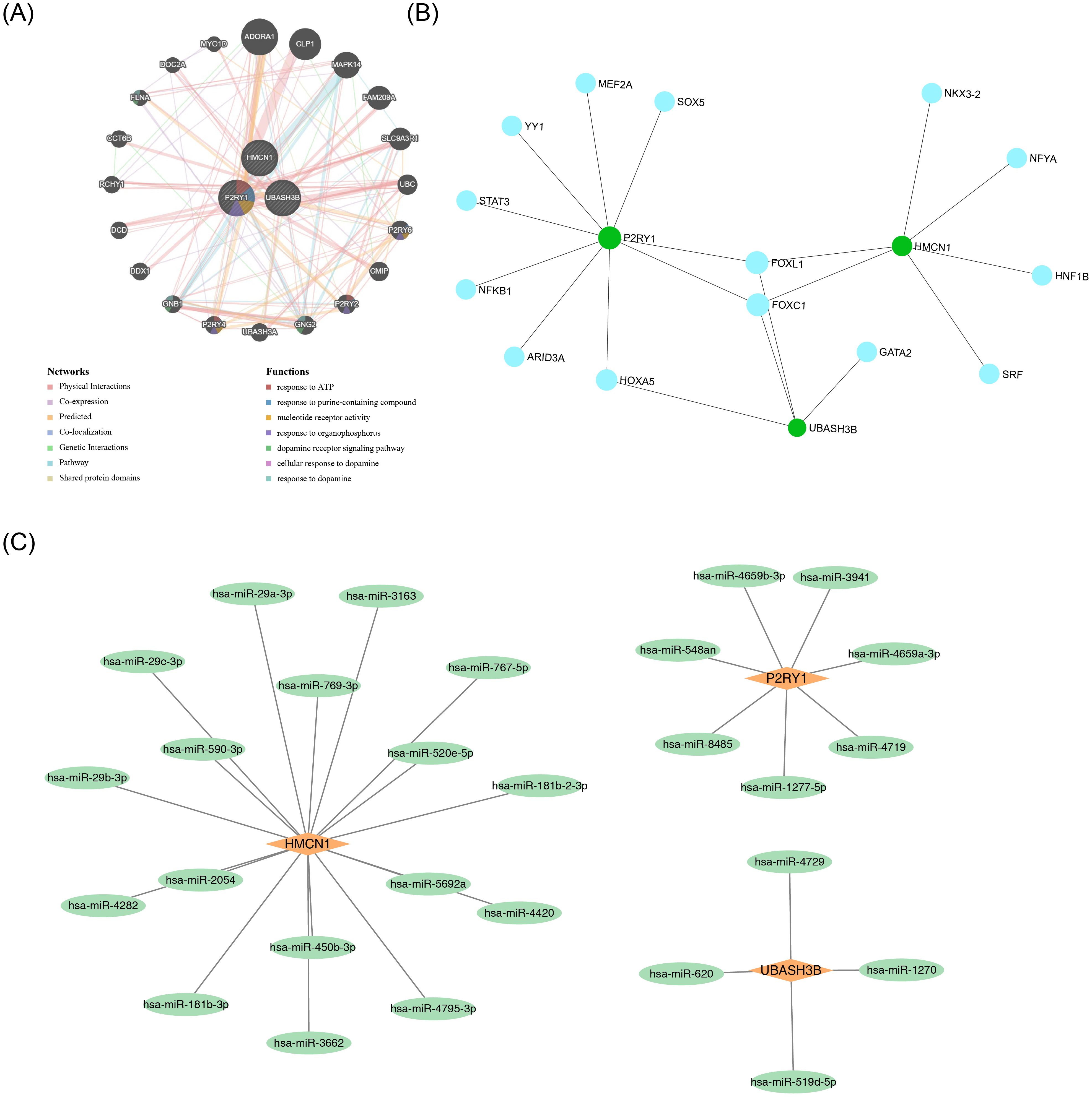 GeneMANIA analysis identified the top 20 predicted genes and the top 7 significant pathways associated with the biomarkers, revealing that they were primarily involved in responses to purine-containing compounds, nucleotide receptor activity, and related processes (Figure 5A). Additionally, 14 transcription factors (TFs) and 28 miRNAs were predicted through the JASPAR and miRDB databases, respectively, and TF-mRNA and miRNA-mRNA networks were constructed. All three biomarkers were found to be regulated by specific TFs and miRNAs (Figures 5B, C).