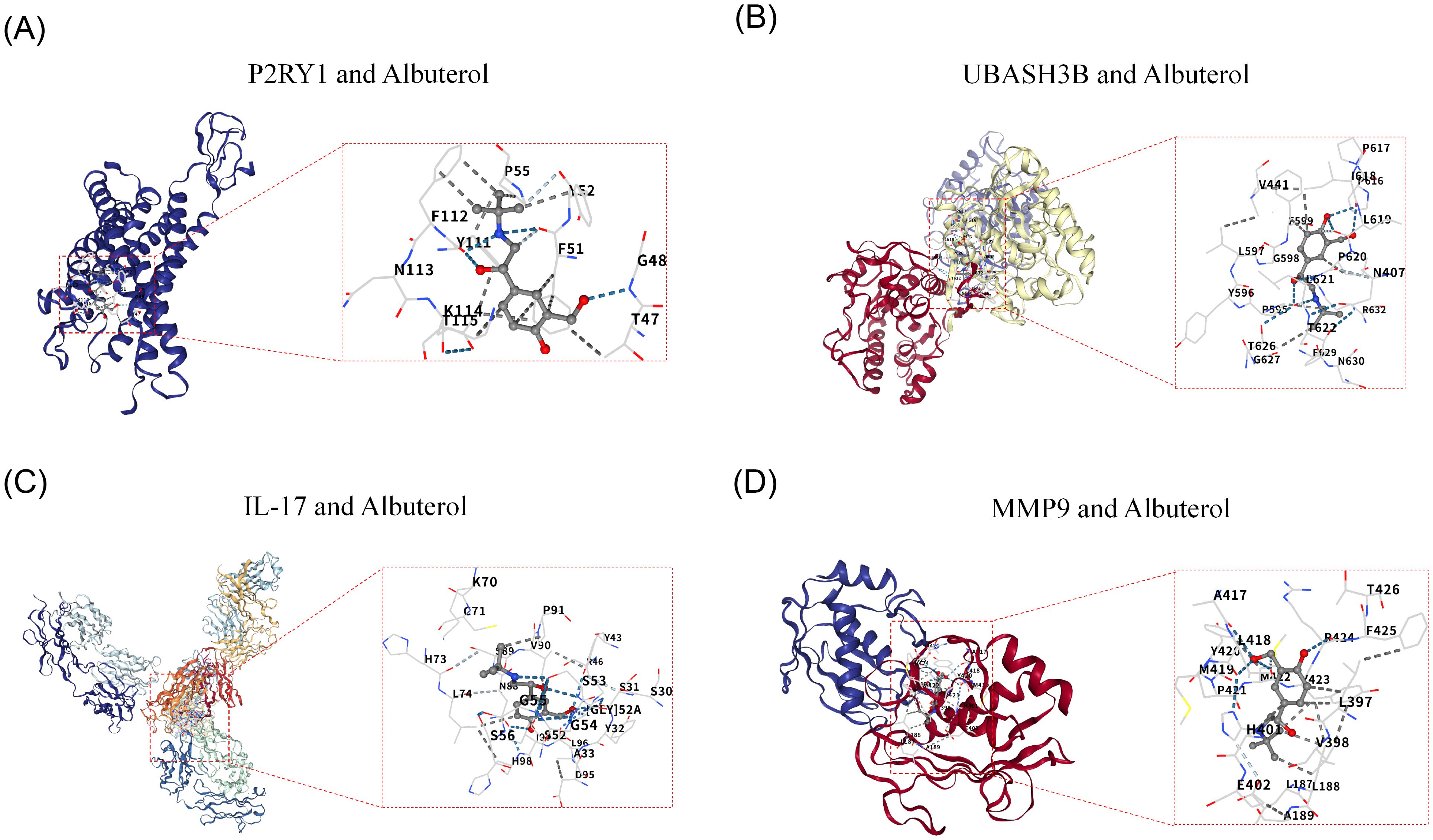 Figure 6. Molecular Docking and Validation of Biomarkers. (A) Docking Diagram of P2RY1 and Albuterol. (B) Docking Diagram of P2RY1 and Albuterol. (C) Molecular Docking Diagram of IL-17 and Drug Albuterol. (D) Molecular Docking Diagram of MMP9 and Drug Albuterol.