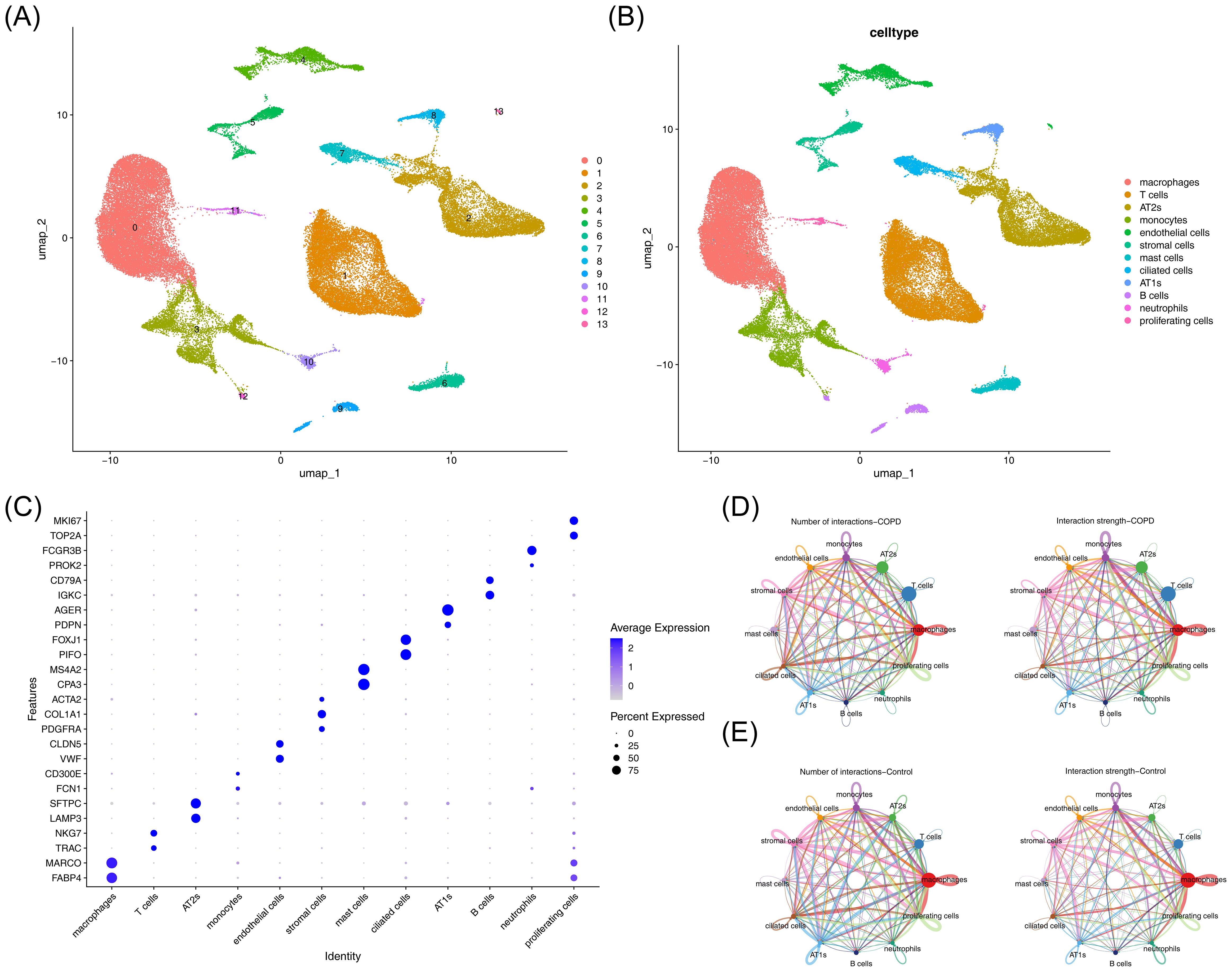 Figure 7. Single-cell analysis of cellular composition and intercellular communication. (A) UMAP clustering plot of cells. (B) Annotation of cell clustering subpopulations. (C) Additional annotation results of cell clustering subpopulations. (D) Cell communication network in the control group. Left panel: Interaction frequency between cells; right panel: Interaction intensity between cells. (E) Cell communication network in the COPD group. Left panel: Interaction frequency between cells; right panel: Interaction intensity between cells.