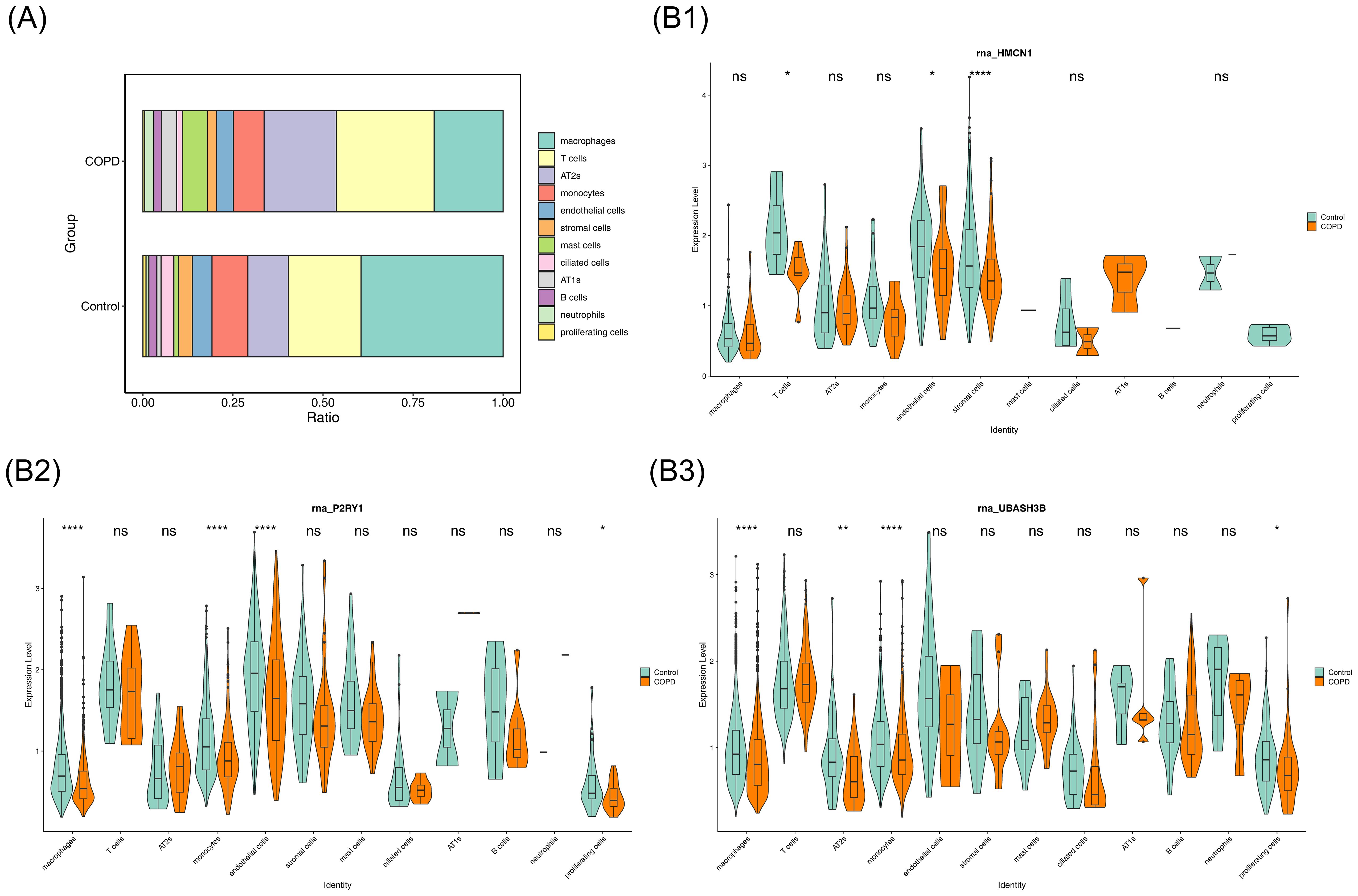 The percentage of cell types in COPD and control samples was explored, revealing a decrease in macrophages and an increase in T cells in the COPD group compared to controls (Figure 8A). Further analysis of biomarker distribution across the 12 cell types between the groups showed that P2RY1 expression was significantly different in macrophages, monocytes, endothelial cells, and proliferating cells, while UBASH3B exhibited marked differences in macrophages, AT2s, monocytes, and proliferating cells. HMCN1 expression was notably different in T cells, endothelial cells, and stromal cells (p < 0.05). These 7 cell types were selected as key cells for further analysis (Figure 8B). Finally, the developmental and differentiation trajectories of the key cells were examined. P2RY1 and HMCN1 expression remained stable during key cell differentiation, whereas UBASH3B expression in macrophages initially decreased, then increased, before stabilizing (Supplementary Figure 2). These dynamic changes in biomarker expression over time were clearly illustrated.