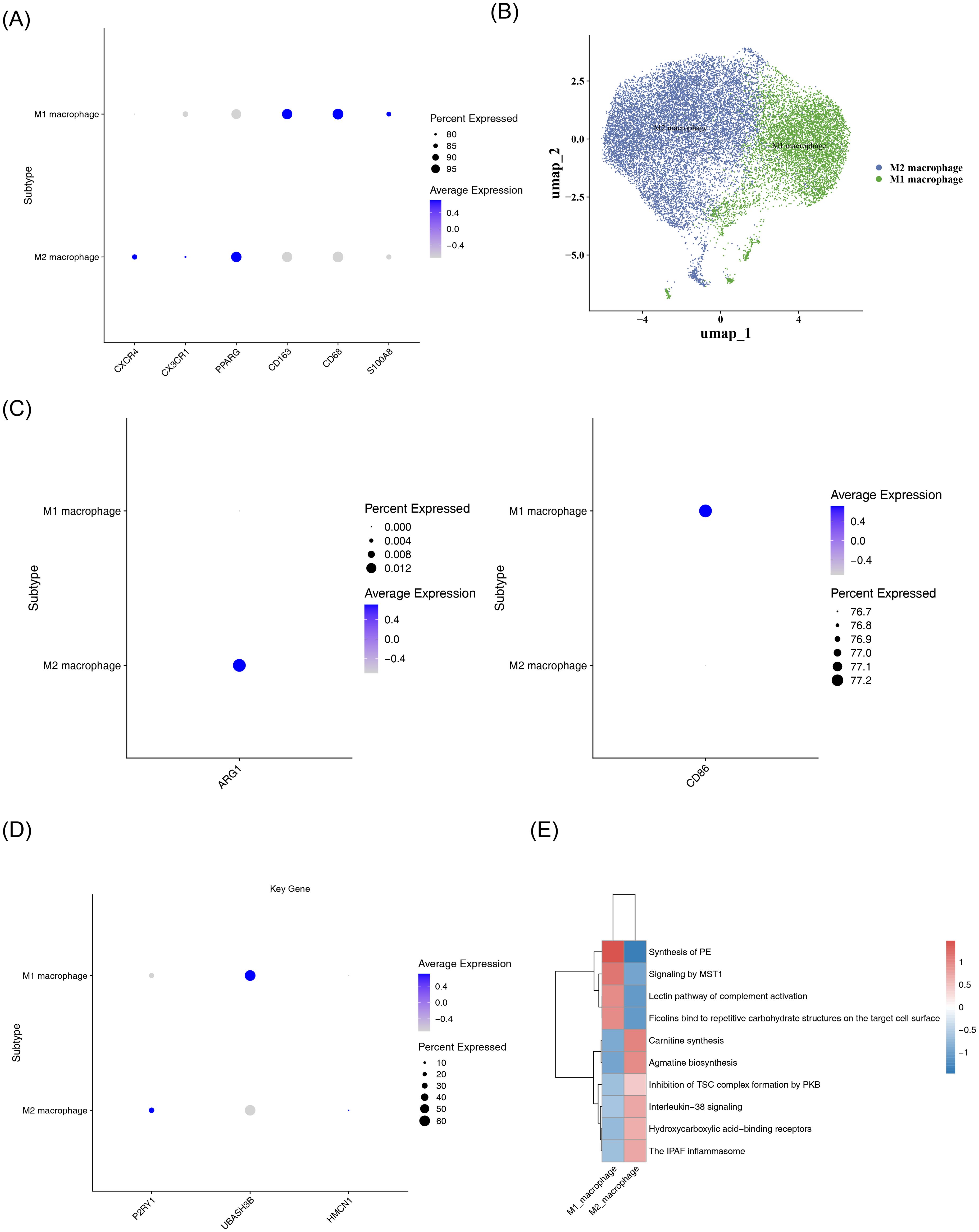 Figure 9. Subtype analysis of macrophages. (A) Bubble plot of marker gene expression in M1 and M2 macrophage subtypes. The color gradient, from blue to gray, indicates the average expression from high to low, and the size of the dots corresponds to the percentage of expressed cells. (B) UMAP dimensionality reduction visualization plot. It shows the distribution characteristics of M1 (blue) and M2 (green) macrophages, with the axes being umap_1 and umap_2, respectively. (C) Bubble plot of polarization marker expression. The left panel shows the average expression of the ARG1 gene in M1 and M2 macrophages; the right panel shows the average expression of the CD86 gene in M1 and M2 macrophages. (D) Bubble plot of P2RY1, UBASH3B, and HMCN1 expression in M1 and M2 macrophages. (E) Heatmap of enriched pathways in M1 and M2 macrophages. The color ranges from blue (low expression/enrichment) to red (high expression/enrichment), indicating the degree of change.