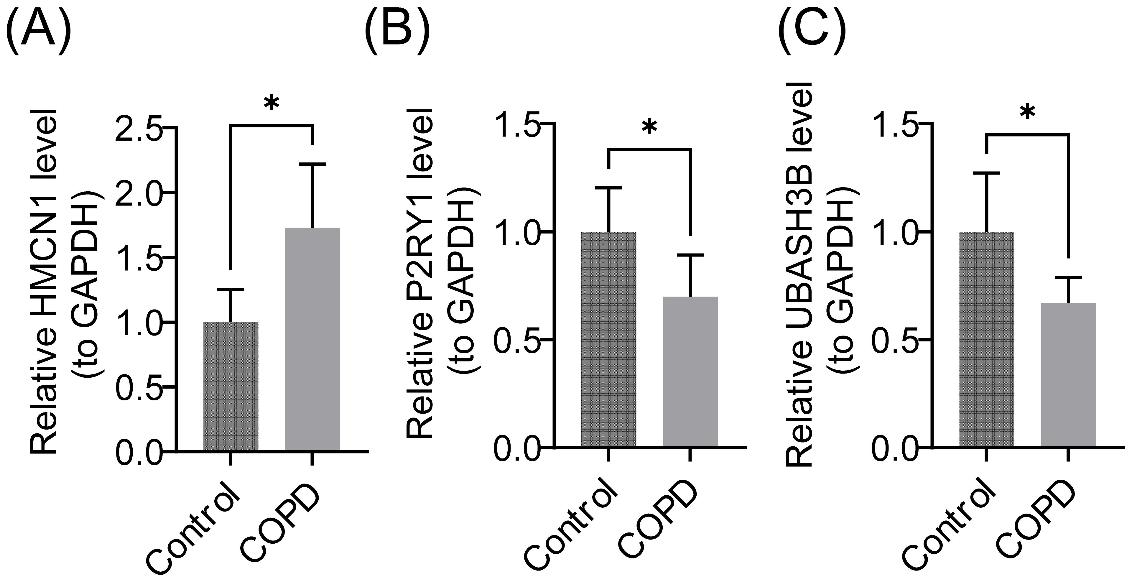 RT-qPCR results indicated that P2RY1 and UBASH3B were significantly downregulated in the COPD group, while HMCN1 was significantly upregulated (Figures 10A–C).
