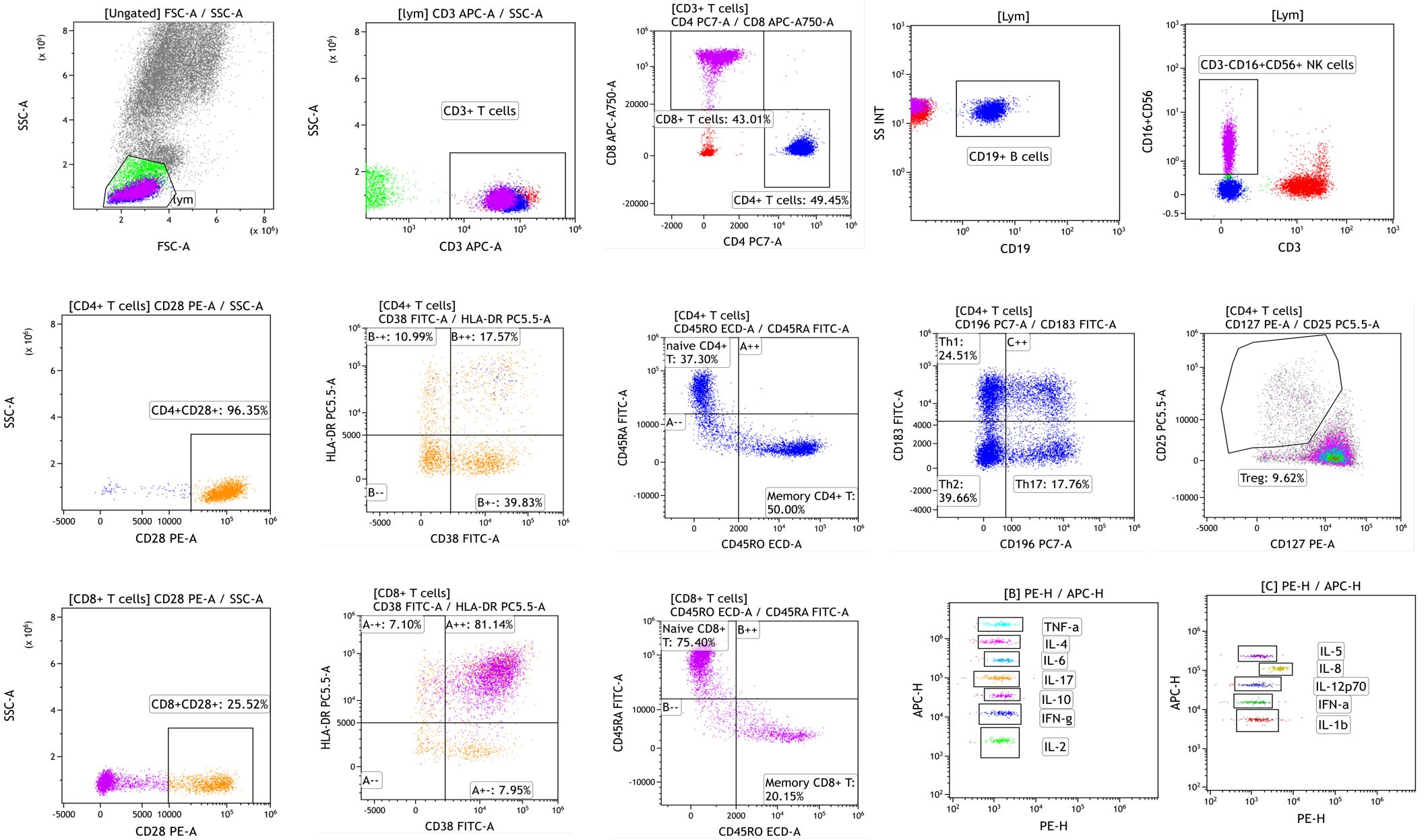 These weightings should be further optimized through clinical validation studies, where the optimal coefficients can be determined based on large-scale data. The methods and platforms are shown in Table 1. The workflow and schematic diagram of flow cytometric analysis of immune cell subsets and cytokine detection are shown in Figure 2.