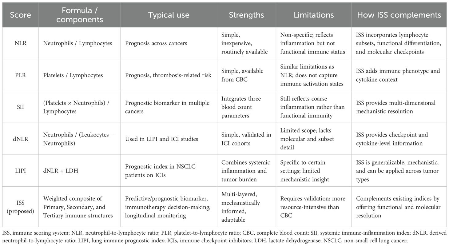 Several simple blood-derived indices have been widely studied as prognostic or predictive biomarkers in oncology, including the neutrophil-to-lymphocyte ratio (NLR), derived NLR (dNLR), platelet-to-lymphocyte ratio (PLR), systemic immune-inflammation index (SII), and the lung immune prognostic index (LIPI) (12). These indices are attractive because they can be calculated from routine complete blood counts and have been associated with outcomes across multiple tumor types. However, they capture only gross features of systemic inflammation or myeloid/lymphoid balance and do not directly represent immune functional states, cellular subsets, or molecular checkpoint activity. By design, the ISS proposed here complements these indices by integrating three hierarchical layers of immune information (basic immune cell populations, functional/phenotypic subsets, and molecular/cytokine signals) into a composite metric that aims to better reflect immune competence and treatment-relevant biology, as shown in Table 2. Where simple indices (e.g., NLR, SII, LIPI) provide rapid screening and risk stratification, ISS is intended to provide greater mechanistic resolution and clinical granularity, particularly for immunotherapy decision-making and longitudinal immune monitoring.