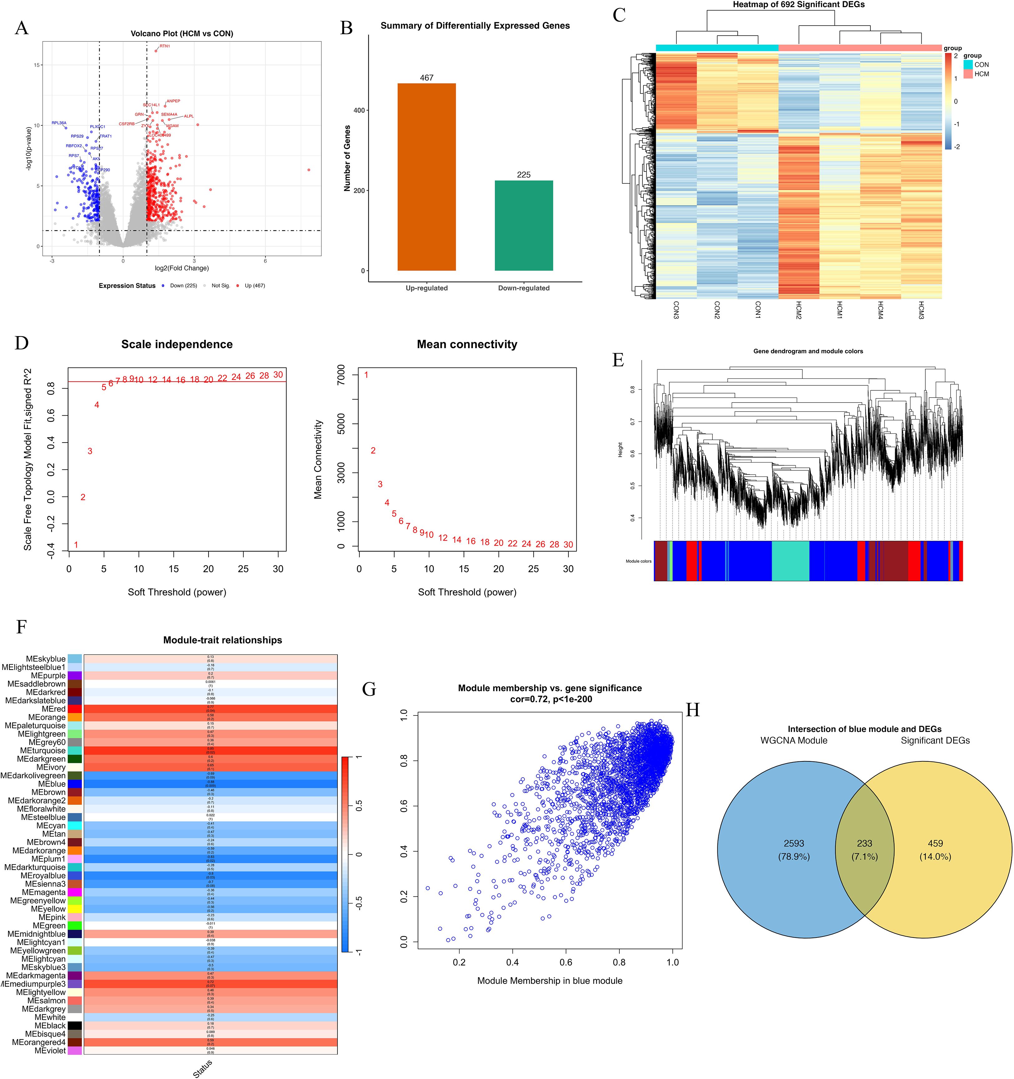 Figure 1. Transcriptomic analysis and WGCNA reveal a key gene module associated with HCM. (A) Volcano plot of differentially expressed genes (DEGs) between HCM and control samples. Each point represents a gene; red points indicate significantly upregulated genes (n = 467), blue points indicate downregulated genes (n = 225), and grey points are non-significant. Vertical dashed lines mark the |log2 fold change| = 1 threshold; the horizontal dashed line indicates adjusted p = 0.05. (B) Bar chart summarizing the number of upregulated (orange) and downregulated (green) DEGs. (C) Heatmap of the top 692 DEGs, clustered by gene expression. Rows represent genes, and columns represent individual samples (CON1–3, HCM1–4). (D) Determination of soft-thresholding power (β) for WGCNA. Left: Scale-free topology fit index (y-axis) across powers (x-axis), with β = 8 selected where R² > 0.85. Right: Mean connectivity analysis showing a decreasing trend as β increases. (E) Gene dendrogram generated from hierarchical clustering based on topological overlap, with dynamic tree cutting identifying multiple co-expression modules (color-coded below dendrogram). (F) Heatmap of module–trait correlations. Each cell represents the Pearson correlation coefficient between module eigengene and HCM status, with p-values in parentheses. The MEturquoise module shows the strongest positive correlation with HCM (r = 0.85, p < 0.001). (G) Scatter plot showing module membership vs. gene significance within the blue module. Each dot represents a gene; a strong positive correlation (r = 0.72, p < 1e–200) indicates module robustness and relevance to HCM phenotype. (H) Venn diagram showing overlap between DEGs and blue module genes. Among 2,826 blue module genes and 692 DEGs, 233 genes are shared (7.1%), representing potential hub candidates.