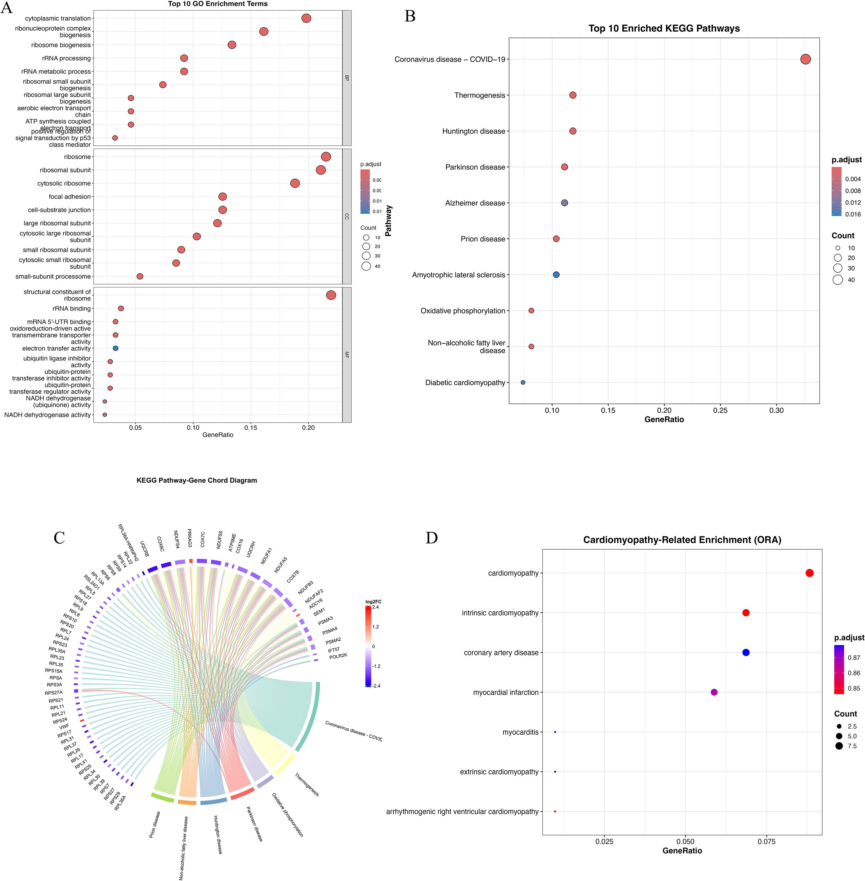 Figure 2. Functional enrichment analysis of overlapping genes from DEGs and WGCNA blue module. (A) Gene Ontology (GO) enrichment analysis of overlapping genes categorized into three domains: biological processes (BP), cellular components (CC), and molecular functions (MF). Dot size represents gene count; color gradient reflects adjusted p-value. (B) Kyoto Encyclopedia of Genes and Genomes (KEGG) enrichment analysis of top 20 pathways. Notable enriched pathways include thermogenesis, oxidative phosphorylation, Huntington’s disease, Parkinson’s disease, Alzheimer’s disease, and diabetic cardiomyopathy. (C) KEGG pathway–gene chord diagram depicting associations between enriched pathways and key genes. Several genes (e.g., NDUFB6, NDUFA9, RPL15) appear in multiple pathways, indicating central regulatory roles in mitochondrial bioenergetics and stress signaling. (D) Disease Ontology (DO) enrichment analysis highlighting cardiomyopathy-related terms. Significant enrichment was observed for intrinsic cardiomyopathy, coronary artery disease, myocardial infarction, and myocarditis, indicating disease specificity of the overlapping gene set. Dot color denotes p-value, and size indicates gene count.
