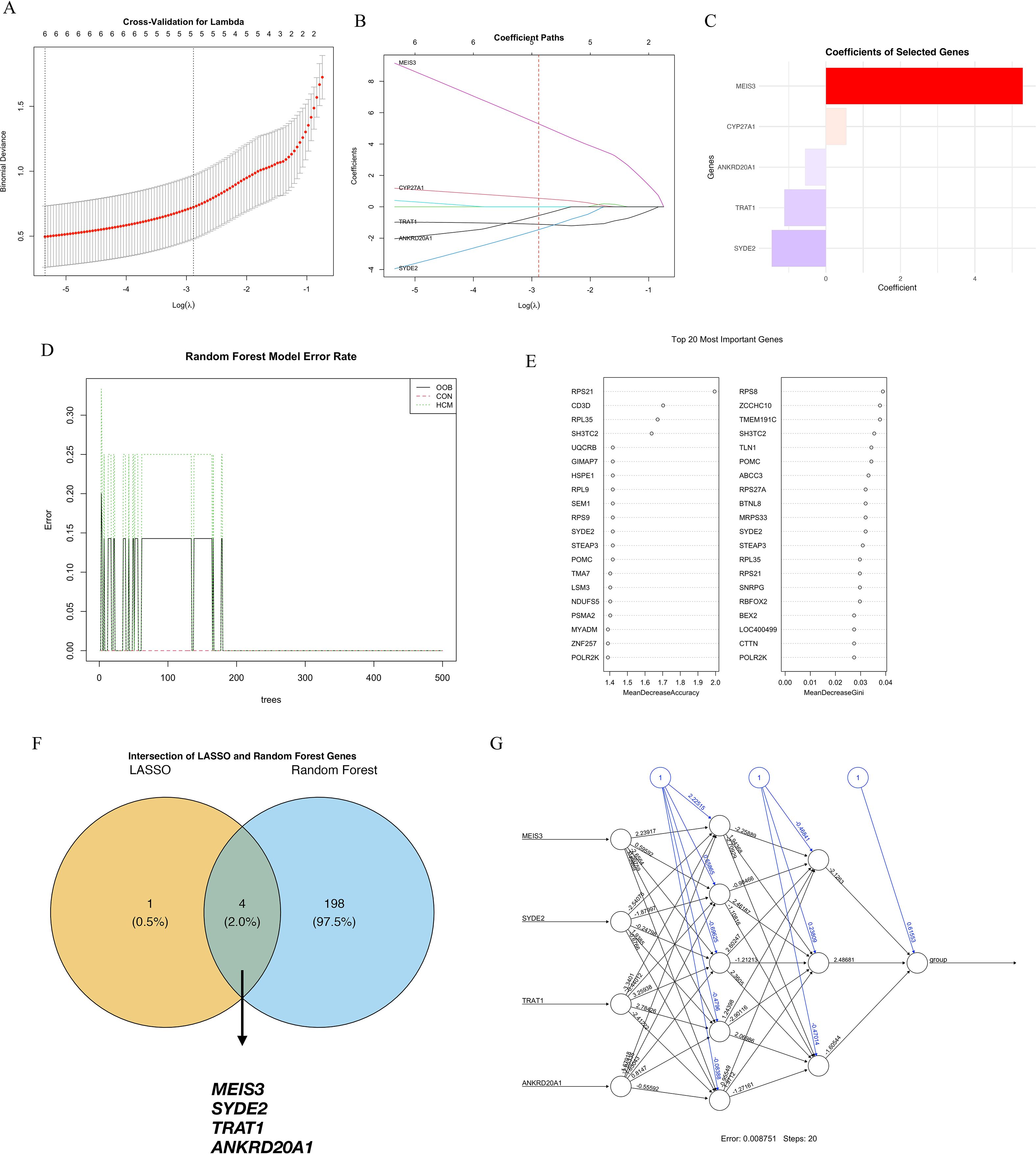 Figure 3. Machine learning-based identification of key diagnostic genes for hypertrophic cardiomyopathy (HCM). (A) Ten-fold cross-validation curve for the LASSO logistic regression model used to select the optimal regularization parameter (λ); the dotted line on the left indicates the λ value with minimum mean cross-validated error. (B) Coefficient paths of selected genes across varying λ values; five genes retained non-zero coefficients at the optimal λ, including MEIS3, CYP7A1, ANKRD20A1, TRAT1, and SYDE2. (C) Bar plot showing the absolute coefficients of LASSO-selected genes, with MEIS3 exhibiting the highest predictive weight. (D) Error rates of the Random Forest classifier for HCM, control, and overall samples stabilized after ~150 trees, indicating good model convergence. (E) Feature importance scores of the top 20 genes in the Random Forest model ranked by mean decrease in accuracy (left) and Gini index (right). (F) Venn diagram showing the intersection between LASSO and Random Forest outputs; four overlapping genes—MEIS3, SYDE2, TRAT1, and ANKRD20A1—were identified as robust diagnostic candidates. (G) Neural network topology using these four genes as input nodes, achieving a final error rate of 0.00751 after 20 training steps, supporting their discriminative potential in HCM classification.
