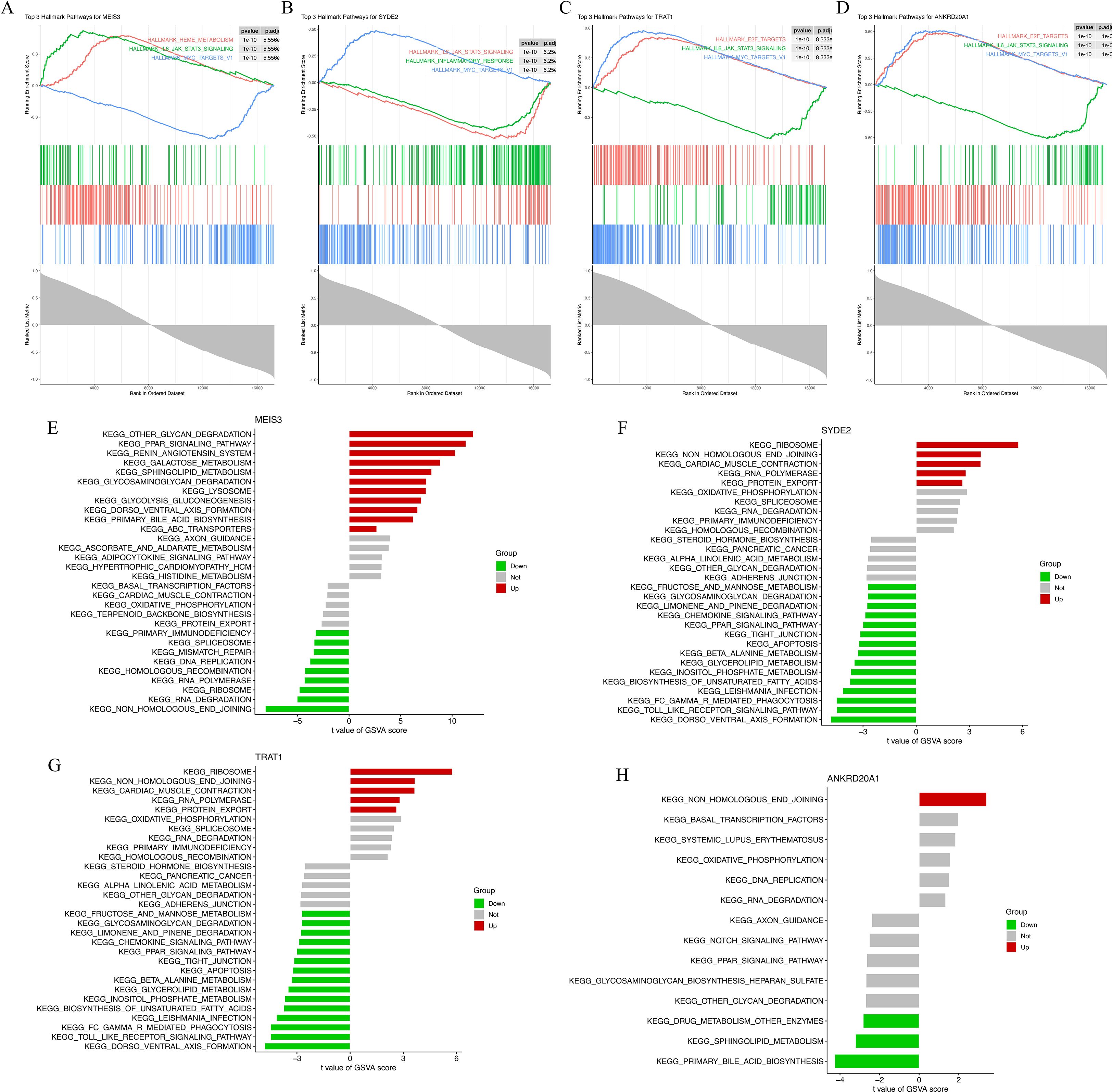 Figure 4. Functional enrichment analysis of four machine learning-derived HCM marker genes. (A–D) Gene Set Enrichment Analysis (GSEA) plots for MEIS3 (A), SYDE2 (B), TRAT1 (C), and ANKRD20A1 (D) based on KEGG gene sets. Enrichment scores (ES) are shown with leading-edge subsets and normalized enrichment scores (NES) indicated for each gene. (E–H) Gene Set Variation Analysis (GSVA) results depicting pathway-level t-values between HCM and control groups for MEIS3 (E), SYDE2 (F), TRAT1 (G), and ANKRD20A1 (H). Red and green bars represent significantly up- or down-regulated pathways, respectively, with gray indicating nonsignificant differences. Pathways span categories including ribosome biogenesis, cardiac muscle contraction, glycan degradation, immune modulation, and oxidative phosphorylation.