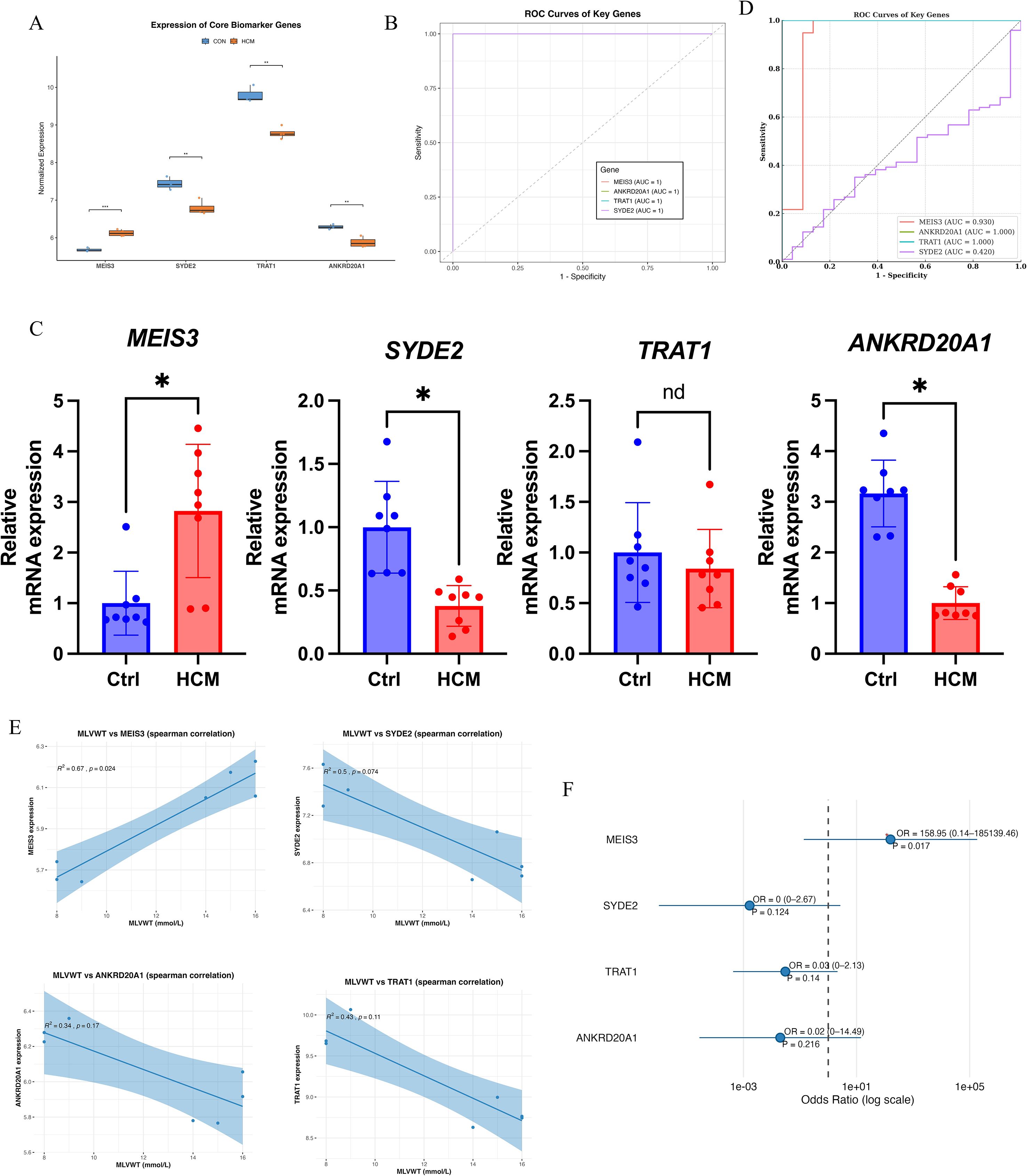 Figure 5. Clinical validation and diagnostic evaluation of key HCM-related genes. (A) Boxplot comparing normalized RNA-seq expression levels of four machine learning–selected genes (MEIS3, SYDE2, TRAT1, ANKRD20A1) between control and HCM groups. MEIS3 expression was significantly upregulated in HCM, while SYDE2, TRAT1, and ANKRD20A1 were downregulated. (B) Receiver Operating Characteristic (ROC) curve analysis demonstrated excellent classification performance for all four genes, each achieving an area under the curve (AUC) of 1.0, indicating high diagnostic potential. (C) qRT-PCR validation in an independent cohort confirmed significantly increased expression of MEIS3 and decreased expression of SYDE2 and ANKRD20A1 in HCM patients (n = 8) compared to controls (n = 8); TRAT1 expression did not differ significantly, suggesting transcript-level variation not reflected at the protein-coding level. (D) ROC curve validation of hub genes in the external GEO dataset (GSE249925). (E) Spearman correlation analysis between gene expression and maximal left ventricular wall thickness (MLVWT), a key clinical parameter of HCM severity (as shown in Table 1), revealed significant positive correlations for MEIS3 (r = 0.67, p = 0.024) and SYDE2 (r = 0.5, p = 0.074), suggesting a possible link with structural myocardial remodeling. ANKRD20A1 and TRAT1 showed non-significant negative trends. (F) Forest plot of odds ratio analysis showed that MEIS3 expression was strongly associated with increased HCM risk (OR = 158.95, p = 0.017), highlighting its clinical relevance as a robust biomarker. Other genes showed non-significant associations (p > 0.1), underscoring MEIS3 as the most reliable diagnostic candidate among the four. * indicated P<0.05.