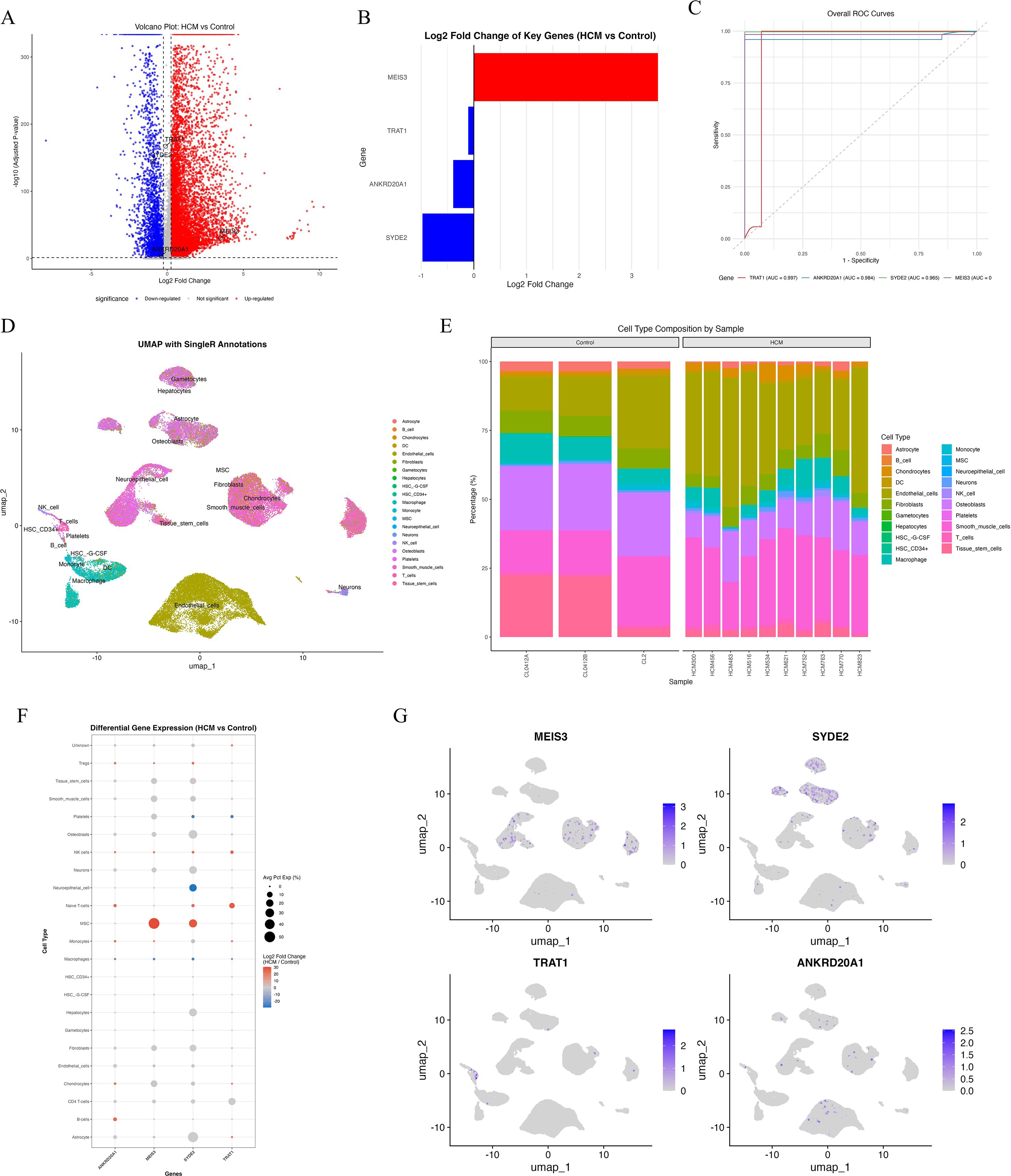 Figure 6. Single-cell transcriptomic analysis reveals cell-type–specific expression patterns of key diagnostic genes in HCM. (A) Volcano plot showing differentially expressed genes in scRNA-seq data comparing HCM versus control samples. MEIS3 is significantly upregulated (red), while SYDE2, TRAT1, and ANKRD20A1 are downregulated (blue). (B) Bar graph showing log2 fold changes of the four key genes between HCM and control samples. (C) ROC curves based on scRNA-seq expression data demonstrating excellent discriminatory performance of MEIS3 among the four genes (AUC ≈ 1.0). (D) UMAP plot with SingleR-based cell-type annotation, depicting distinct clustering of major immune and stromal cell populations including monocytes, T/NK cells, fibroblasts, endothelial cells, and mesenchymal stem cells (MSCs). (E) Bar plot showing cell-type composition per sample. A noticeable increase in MSC proportion is observed in HCM samples compared to controls. (F) Dot plot of cell-type–specific differential expression. MEIS3 is selectively upregulated in MSCs, while SYDE2, TRAT1, and ANKRD20A1 are generally downregulated in multiple cell types including fibroblasts, macrophages, and monocytes. Dot size represents percentage of expressing cells; color denotes log2 fold change. (G) UMAP feature plots for MEIS3, SYDE2, TRAT1, and ANKRD20A1. MEIS3 expression is predominantly localized to the MSC cluster, whereas the other three genes show low and scattered expression across cell populations.