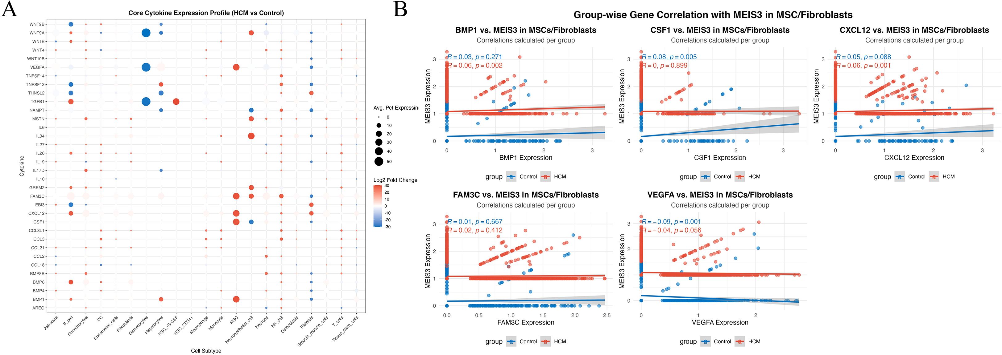 Figure 7. Cytokine expression landscape and MEIS3-associated signaling interactions in MSCs/fibroblasts. (A) Dot plot illustrating the average expression and log2 fold change of 40 key cytokines across 21 annotated cell types in HCM versus control conditions. Each dot represents the mean expression percentage (dot size) and direction of differential expression (color scale: red = upregulated; blue = downregulated). Notably, MEIS3-enriched mesenchymal stem cells (MSCs) and fibroblasts displayed pronounced dysregulation of cytokines such as BMP1, CXCL12, CSF1, and VEGFA. (B) Group-wise correlation analyses between MEIS3 expression and representative cytokines in MSCs/fibroblasts. Spearman correlation coefficients (r) and p-values are shown separately for control (blue) and HCM (red) groups. MEIS3 expression in HCM MSCs positively correlated with BMP1 (r = 0.06, p = 0.002) and CXCL12 (r = 0.06, p = 0.001), while an inverse association was observed with VEGFA (r = –0.04, p = 0.056). No significant correlations were found for FAM3C or CSF1 within the HCM group. These results suggest that MEIS3 may participate in fibroblast/MSC-mediated paracrine regulation in HCM through selective cytokine interaction.