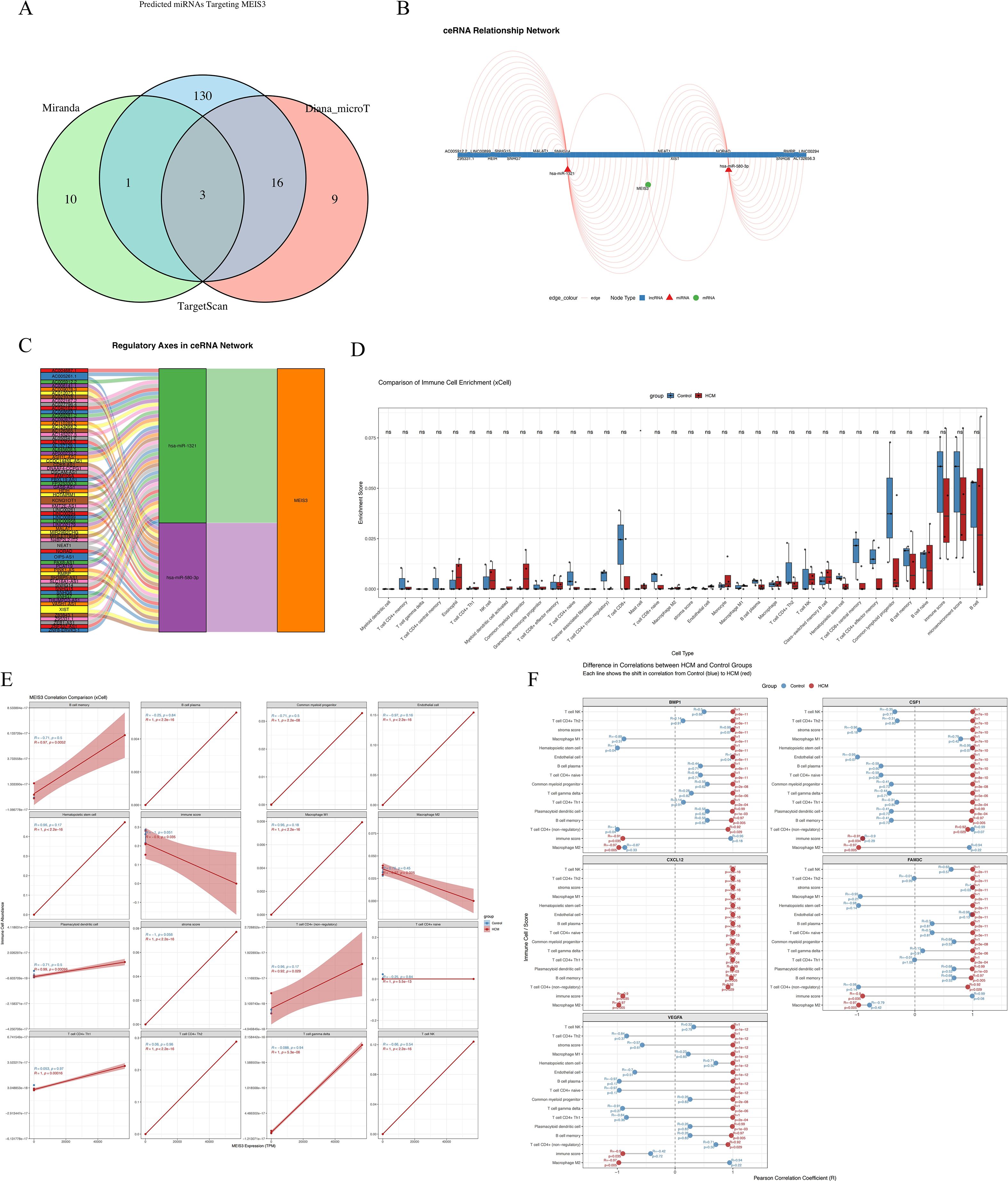 Figure 8. Construction of MEIS3-related ceRNA regulatory network and immune cell infiltration landscape in HCM. (A) Venn diagram displaying the intersection of predicted miRNAs targeting MEIS3 from three databases (miRanda, TargetScan, and Diana_microT), identifying 3 common miRNAs. (B) ceRNA network visualization including lncRNAs, miRNAs, and MEIS3, with red triangles indicating lncRNAs, green circles indicating miRNAs, and blue squares representing mRNAs. Regulatory edges highlight potential competing interactions. (C) Regulatory axis diagram illustrating the ceRNA pathway of MEIS3, showing multi-layered lncRNA–miRNA–mRNA relationships. Notably, MEIS3 is positioned as a central node downstream of multiple axes. (D) Immune cell enrichment analysis using xCell revealed significantly altered immune/stromal cell populations in HCM compared to controls. Notably, fibroblasts, endothelial cells, macrophages M1/M2, and dendritic cells (aDCs, pDCs) displayed robust enrichment differences (Wilcoxon test, p < 0.05). (E) MEIS3 expression exhibited statistically significant correlations with selected immune cell types in the HCM group, especially macrophages, dendritic cells, and endothelial cells. Shaded bands represent 95% confidence intervals (Spearman correlation, p < 0.05). (F) Correlation heatmap illustrating disease-specific associations between five representative cytokines (BMP1, CSF1, CXCL12, FAM3C, VEGFA) and differentially enriched xCell-derived immune cell types in the HCM group. Distinct patterns were observed for cytokine–cell type relationships, with stronger or inverse correlations in HCM, suggesting disease-specific immune remodeling.