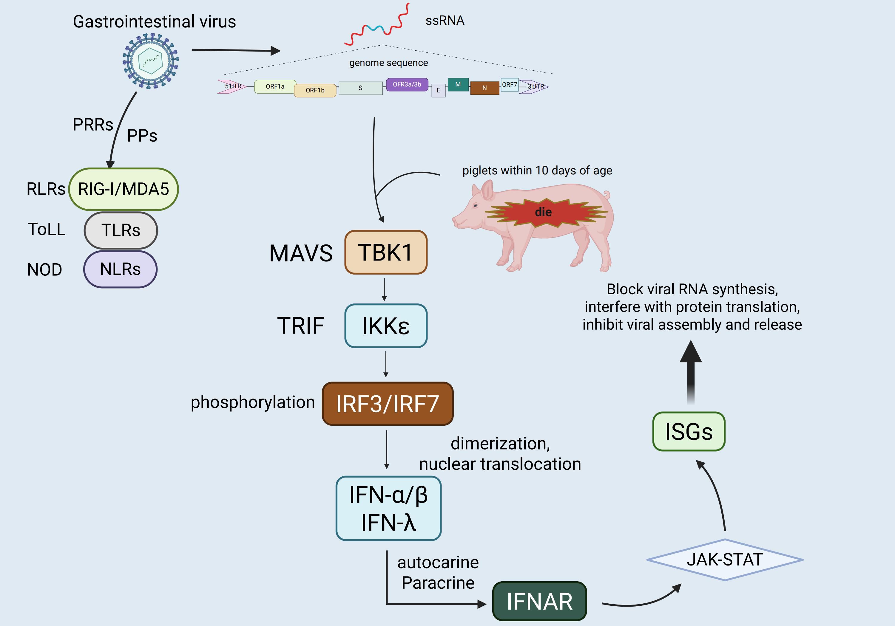 Upon viral infection, host cells detect viral nucleic acids via PRRs, leading to the recruitment of specific adapter proteins (e.g., MAVS, TRIF, MyD88). These adapter proteins subsequently activate the downstream signaling molecules TANK-binding kinase 1 (TBK1) and IKKϵ, which phosphorylate transcription factors IRF3 and IRF7 (36–38). This phosphorylation prompts the dimerization and nuclear translocation of IRF3 and IRF7, thereby initiating the transcriptional expression of type I interferons (IFN-α/β) and type III interferons (IFN-λ) (39, 40). In the context of antiviral immunity in the intestinal mucosa, type III interferons exhibit greater tissue specificity and targeting compared to type I interferons (41). Due to the predominant expression of its receptor (IFNLR1/IL10R2) on epithelial cells, IFN-λ enhances local antiviral defense effectively while limiting inflammation, thereby playing a pivotal role in maintaining intestinal immune homeostasis and controlling local viral infections (42, 43). Subsequently, the secreted interferons bind to their respective receptors on target cells through autocrine and paracrine mechanisms (type I interferons bind to IFNAR1/2, and type III interferons bind to IFNLR1/IL10R2), activating the JAK-STAT signaling pathway and inducing the expression of numerous interferon-stimulated genes (ISGs) (44–46). These ISGs can impede various stages of the viral life cycle, including viral RNA synthesis, protein translation, and viral assembly and release, collectively establishing an effective innate antiviral barrier (47, 48). However, neonatal piglets under one week of age, characterized by an immature immune system, exhibit low expression levels of PRRs and downstream signaling molecules, limiting the efficiency of the interferon response. Consequently, this inadequate response fails to promptly control viral infections in the early stages, contributing significantly to their heightened susceptibility to enteric viruses like TGEV and the associated elevated mortality rate (49), Figure 2.