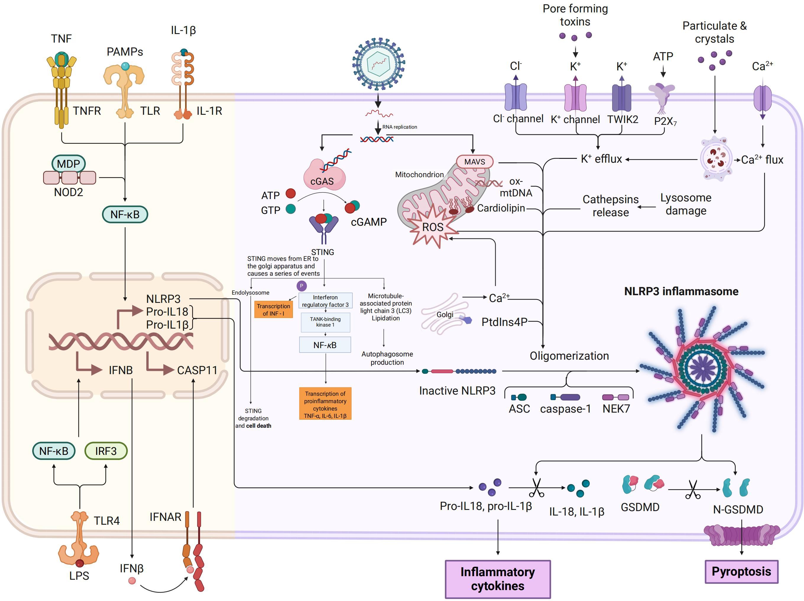 Figure 2. Schematic representation of NLRP3 inflammasome and cGAS-STING pathway activation. This figure illustrates the activation mechanisms and downstream effects of the NLRP3 inflammasome (on the left) and the cGAS-STING pathway (on the right), highlighting their interconnections in innate immune responses. The left panel shows that priming signals, which are mediated by TNFR, TLR, and IL-1R upon stimulation with TNF, PAMPs, and IL-1β, lead to NF-κB activation and NLRP3 inflammasome assembly. This assembly process involves nucleotide - binding oligomerization domain - containing protein 2 (NOD2), muramyl dipeptide (MDP), ATP, K+ efflux, and ROS, ultimately inducing caspase - 11 (CASP11) and interferon - β (IFNB) expression, pyroptosis, and IL-1β release. The right panel illustrates cyclic GMP - AMP synthase (cGAS) binding to cytosolic DNA to generate cGAMP, which activates STING translocation from the endoplasmic reticulum (ER)to the Golgi and subsequently triggers the activation of interferon regulatory factor 3 (IRF3) and NF-κB, resulting in antiviral responses and pro-inflammatory cytokine production. Shared regulatory elements include ROS and Ca²+ perturbations, mitochondrial damage, and lysosomal rupture, with organelles such as lysosomes, mitochondria, and autophagosomes contributing to inflammasome activation, pyroptosis, and cytokine synthesis.