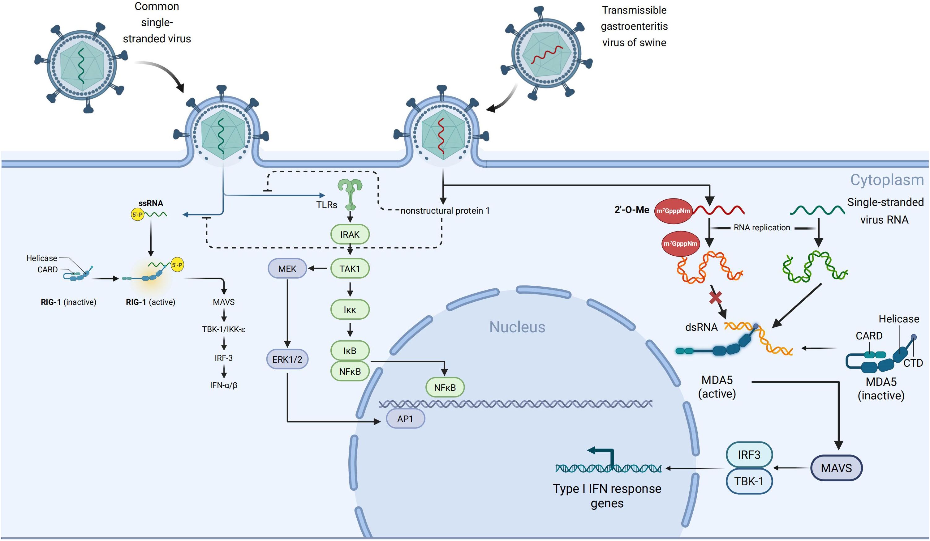 Figure 3. Mechanisms by which TGEV evades host PRRs-mediated innate immune responses. In uninfected cells, viral RNA is recognized by endosomal Toll-like receptors (TLR3/TLR7) or cytoplasmic sensors such as Melanoma Differentiation - Associated Gene 5 (MDA5). This recognition triggers downstream signaling cascades via adaptor kinases and transcription factors, ultimately leading to the production of type I interferons and pro - inflammatory cytokines.However, during TGEV infection, viral non-structural proteins (NS) inhibit key signaling nodes by promoting protein degradation or functional inactivation, thereby disrupting the TLR/RLR signaling pathways. This results in impaired nuclear translocation of IRF3 and NF-κB,along with reduced cytokine expression. In addition, TGEV evades MDA5 recognition by modifying the viral RNA cap structure through 2’-O methylation (m7GpppNm), which prevents MDA5 binding and subsequent activation of downstream signaling.