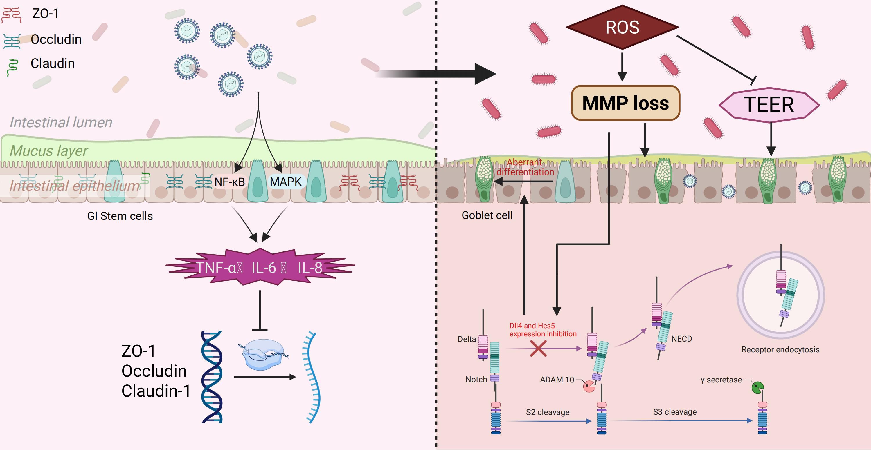 Figure 4. TGEV-induced disruption of intestinal barrier and modulation of Notch signaling. TGEV infection activates NF-κB and MAPK pathways, promoting inflammatory cytokine release (TNF-α, IL-6, IL-8) and downregulating tight junction proteins (ZO-1, Occludin, Claudin-1), leading to barrier dysfunction. Excess ROS impairs mitochondrial function, reduces TEER, and inhibits Dll4 and Hes5 expression in the Notch pathway, causing aberrant differentiation of GI stem cells into goblet cells, which may facilitate viral replication and spread.