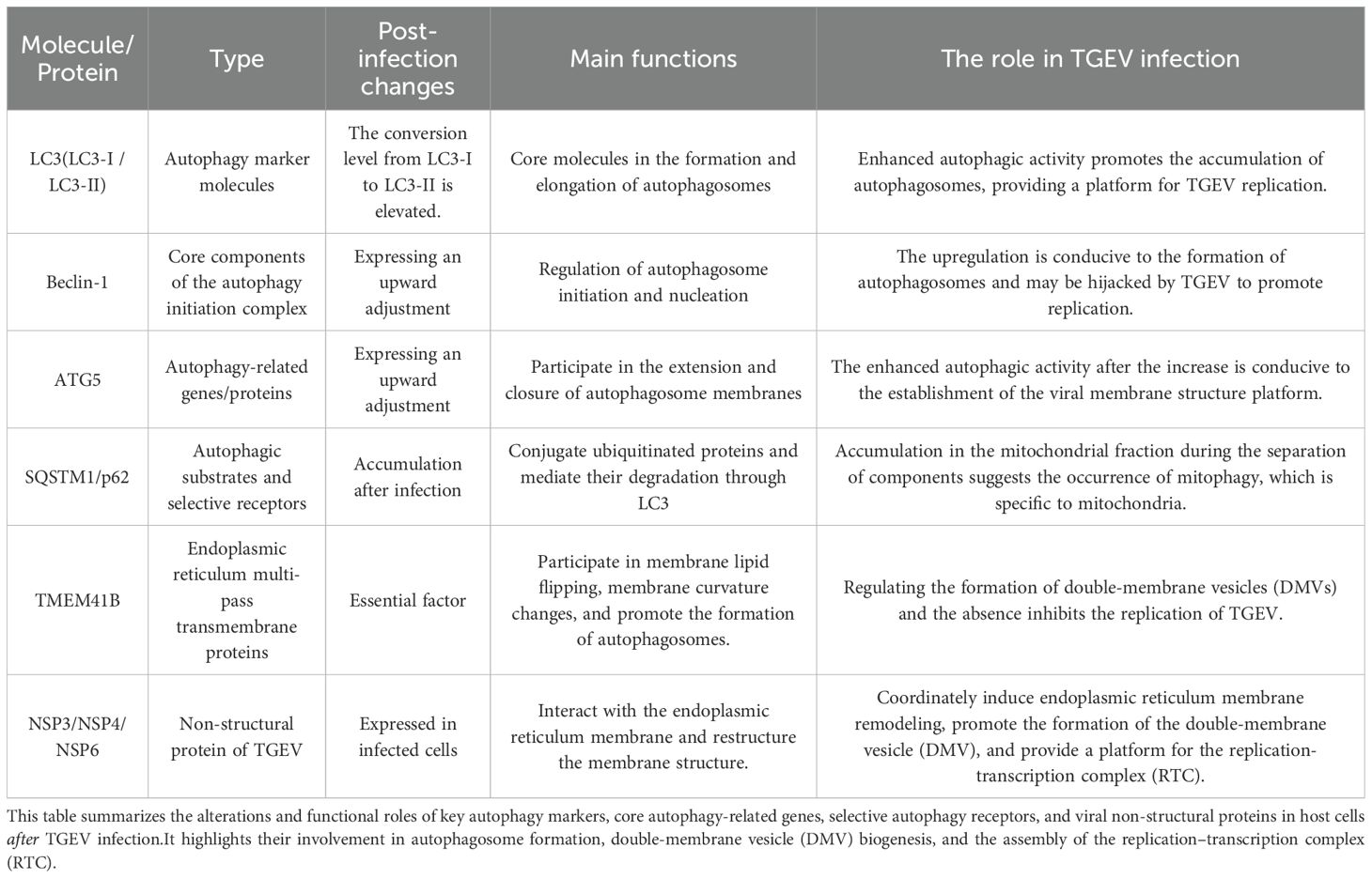 However, the above-mentioned autophagic response does not necessarily mean that the TGEV is cleared by host cells. On the contrary, evidence suggests that the virus may exploit this process to facilitate its replication and amplification, as shown by [Zhu et al.,2016] (127, 130). Recent studies have identified transmembrane protein 41B (TMEM41B) as a pivotal regulator during TGEV infection. TMEM41B is a protein with multiple transmembrane domains that is situated in the endoplasmic reticulum, is recognized as a key player in regulating membrane lipid translocation and curvature alterations, crucial for autophagosome formation. TGEV infection leverages TMEM41B-mediated membrane remodeling to generate double-membrane vesicles (DMVs), serving as a spatial platform for viral replication and transcription. Experimental data demonstrate that depletion or inhibition of TMEM41B significantly disrupts DMV formation, consequently impeding effective TGEV replication in host cells.Furthermore, several NSPs encoded by TGEV, such as NSP3, NSP4 and NSP6, could also interact with the endoplasmic reticulum membrane system to restructure the host cell membrane architecture. These NSPs collaborate to recruit lipids, induce local membrane expansion, and facilitate endoplasmic reticulum membrane bending, promoting DMV formation to support the assembly of the replication-transcription complex (RTC) (126). Consequently, TGEV orchestrates an intracellular replication niche conducive to its life cycle by finely regulating factors associated with the host autophagy pathway and membrane dynamics (Table 1).